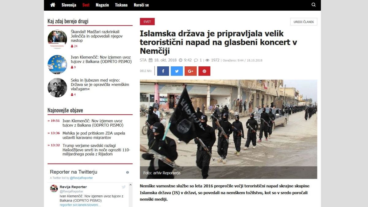"Sporni" članek je korektno napisano poročilo o leta 2016 preprečenem terorističnem napadu Islamske države v Nemčiji. O tem so poročali praktično vsi pomembnejši nemški mediji, v Sloveniji pa je članek Slovenske tiskovne agencije poleg Reporterja povzelo še nekaj drugih slovenskih medijev.