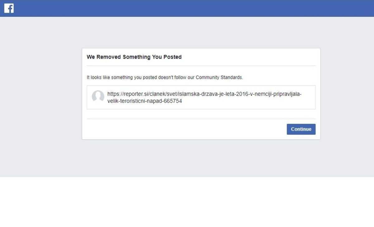 Facebook je z Reporterjevega profila odstranil povezavo do članka "Islamska država je pripravljala velik teroristični napad na glasbeni koncert v Nemčiji". Pravega pojasnila o odstranitvi nismo dobili, le avtomatizirano sporočilo, da objava ni ustrezala standardom Facebookove skupnosti.