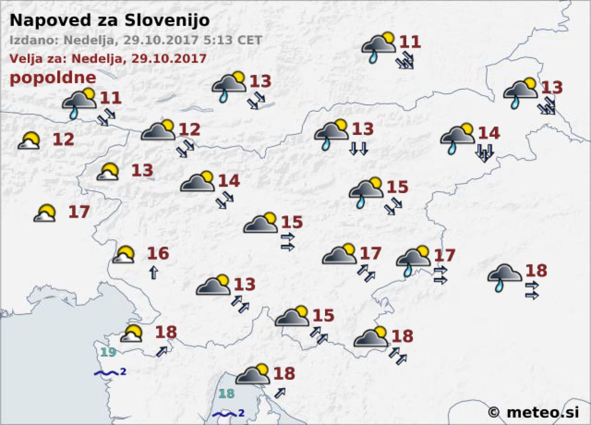 Nedelja bo vetroven dan. Dopoldne in sredi dneva bo v notranjosti Slovenije pihal okrepljen jugozahodni veter, popoldne pa se bo obračal na severno do severozahodno smer. Predvsem na Štajerskem in v Pomurju bodo najmočnejši sunki ponekod lahko presegli hitrost 70 km na uro.