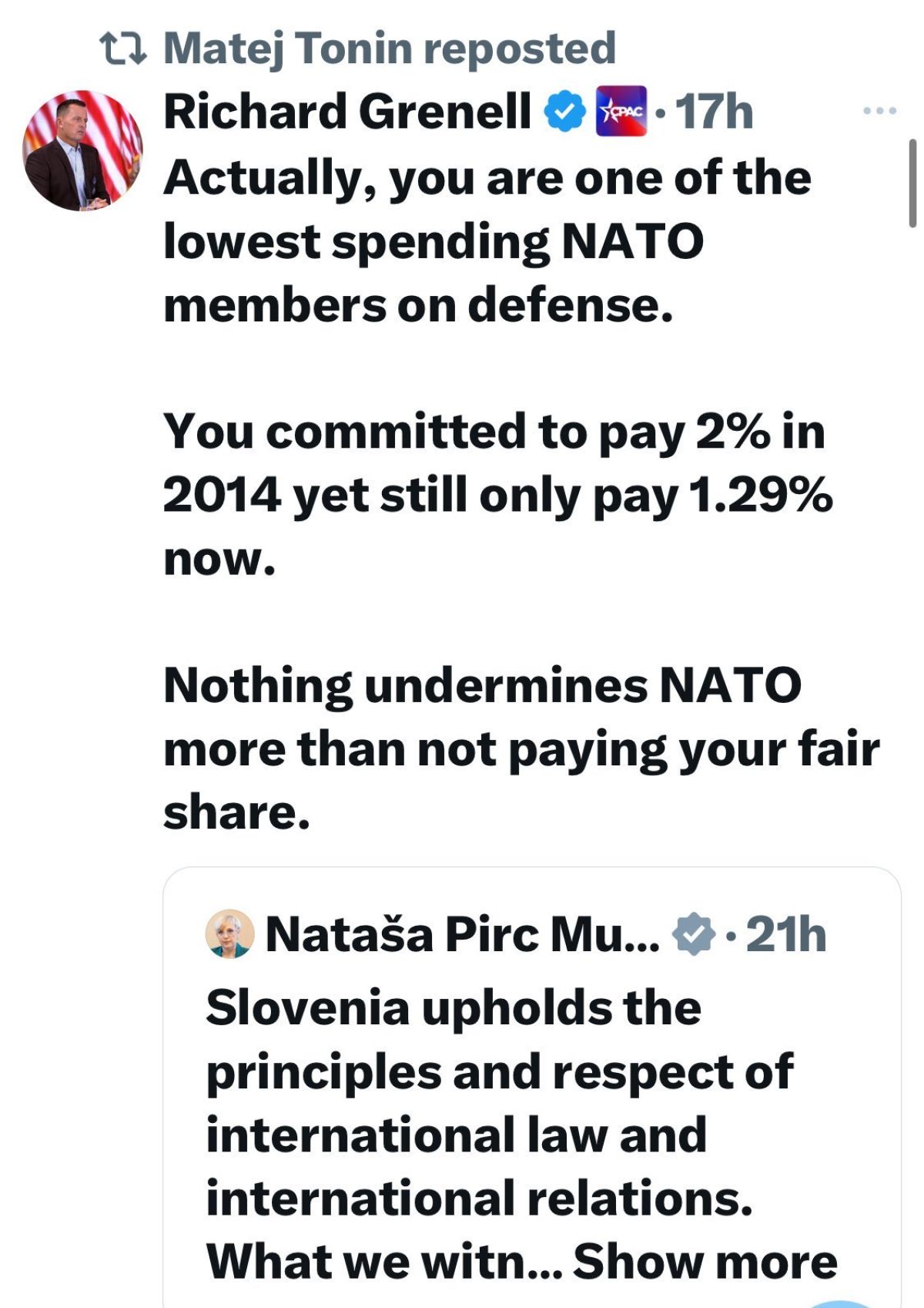 Na objavo predsednice se je odzval Richard Grenell, ameriški diplomat in Trumpov odposlanec za posebne misije, ki je Sloveniji očital, da ima ene od najnižjih obrambnih izdatkov v zvezi Nato. »Leta 2014 ste se zavezali, da boste za obrambo dajali dva odstotka BDP, pa še vedno plačujete le 1,29 odstotka. Nič ne spodkopava Nata bolj neplačevanje poštenega deleža.«