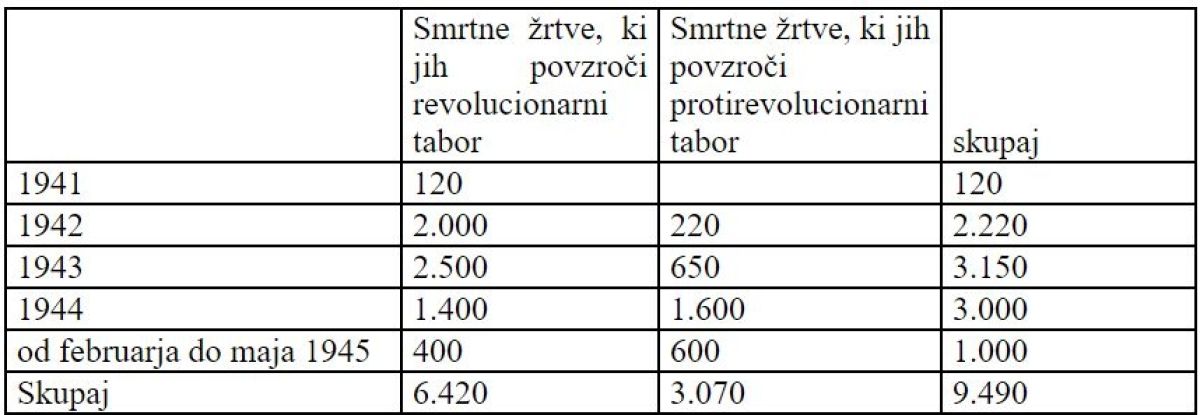 *K temu številu je treba prišteti nekaj tisoč žrtev, ki jih partizanski nasprotniki povzročijo v sodelovanju z okupatorskimi silami, partizanska stran pa s svojim načinom vojskovanja.