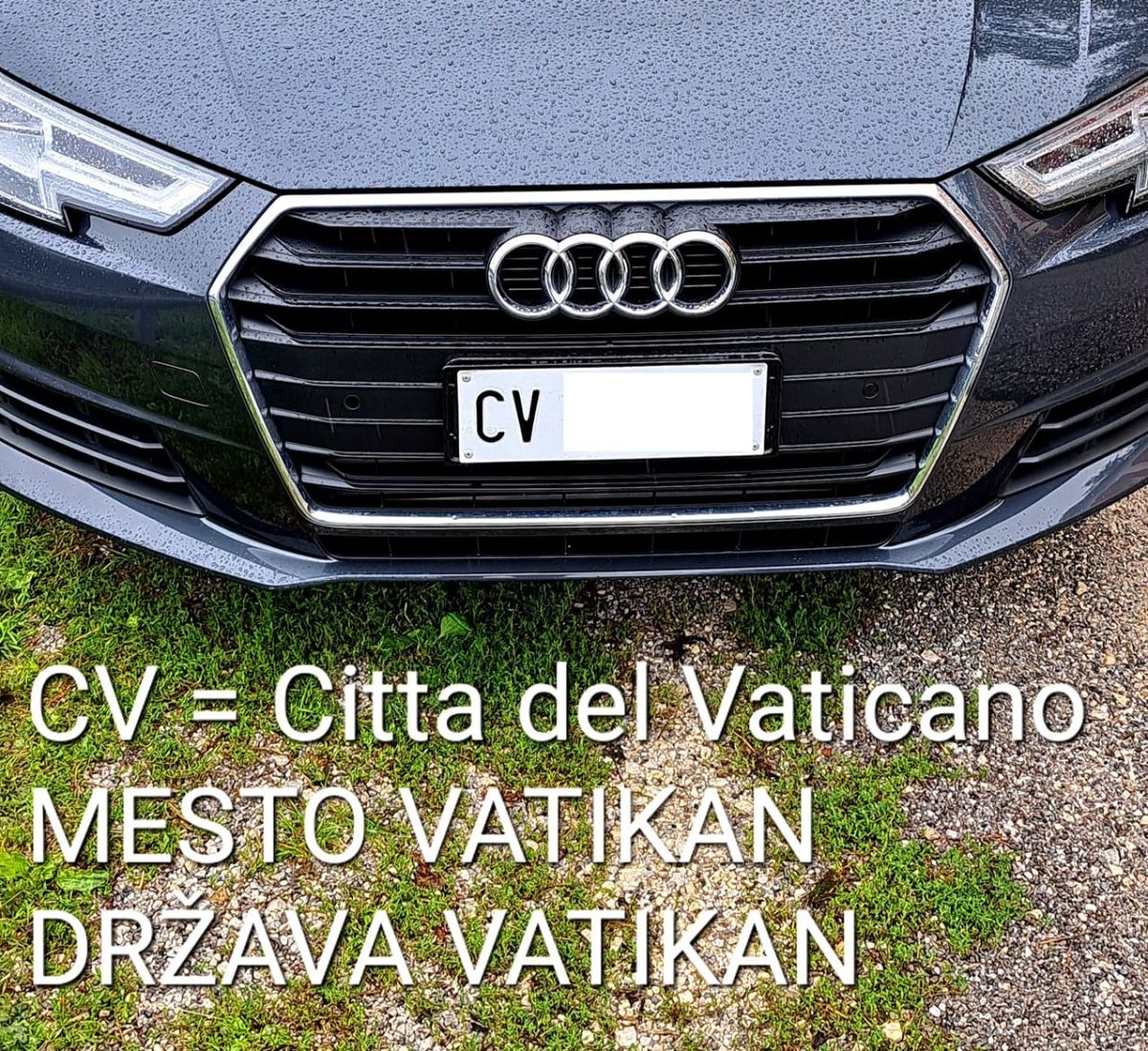 Pred cerkvijo je poglede privabljal Rodetov audi z vatikansko registracijo, ki je edinstven v Sloveniji. CV je namreč okrajšava za Citta del Vaticano (Mesto Vatikan) in razumljivo vozila s to registrsko tablico redko vidite že v Rimu, kaj šele na Dolenjskem.