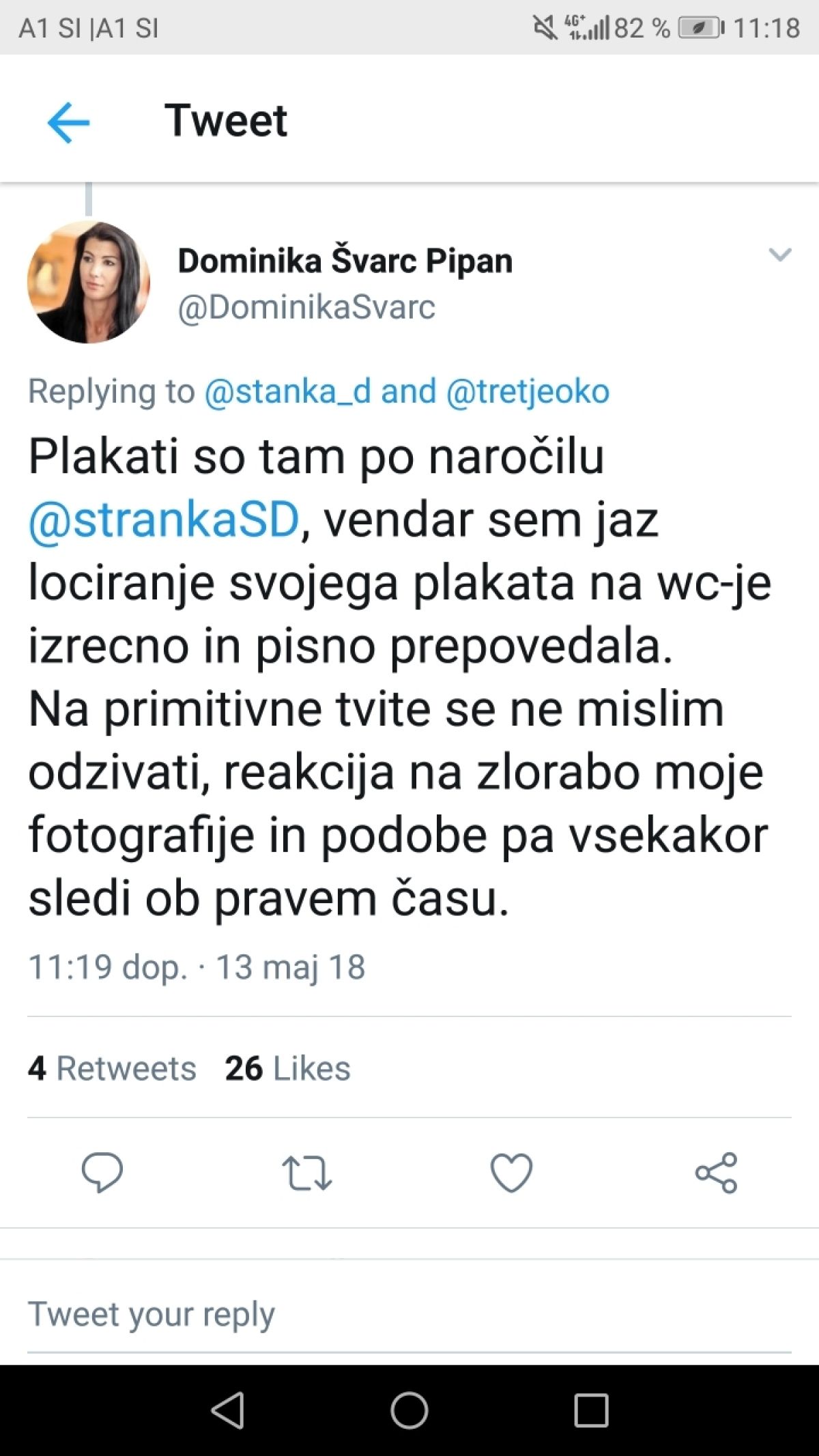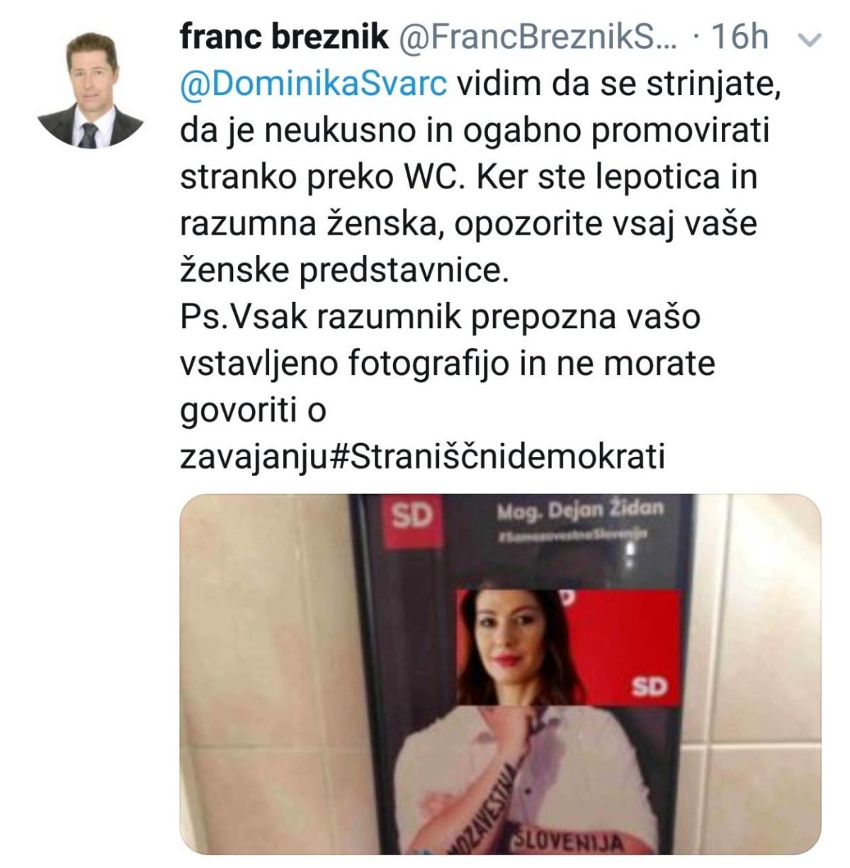 Nato ji je odgovoril še Breznik: »@DominikaSvarc vidim da se strinjate, da je neukusno in ogabno promovirati stranko preko WC. Ker ste lepotica in razumna ženska, opozorite vsaj vaše ženske predstavnice. Ps. Vsak razumnik prepozna vašo vstavljeno fotografijo in ne morate govoriti o zavajanju#Straniščnidemokrati«