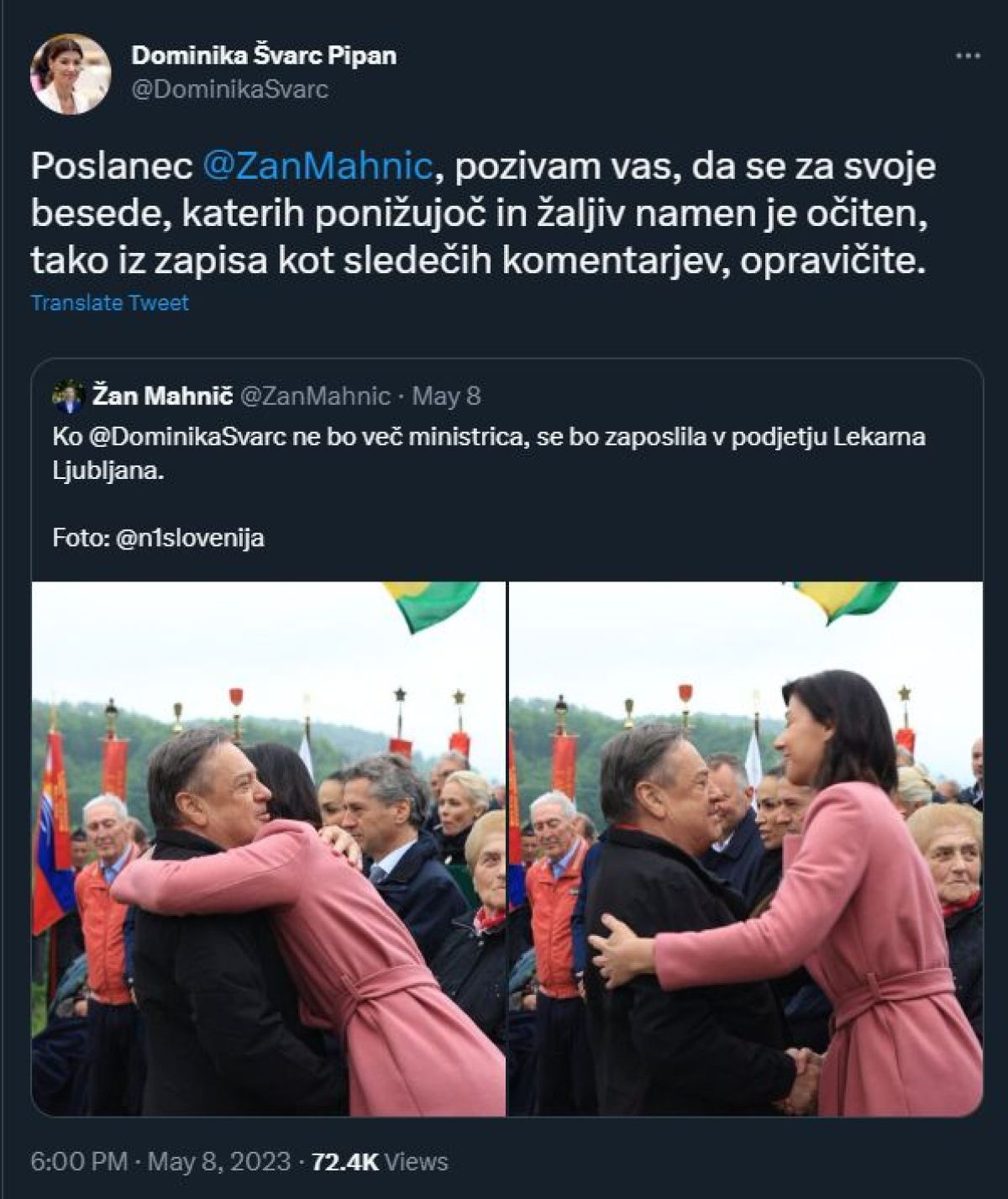 Zaradi ene take pripombe Švarc Pipanova zdaj terja opravičilo. Vznemiril jo je namreč tvit poslanca SDS Žana Mahniča, ki je ob fotografiji objema pripisal, da se bo Dominika Švarc Pipan, ko ne bo več ministrica, zaposlila v podjetju Lekarna Ljubljana.