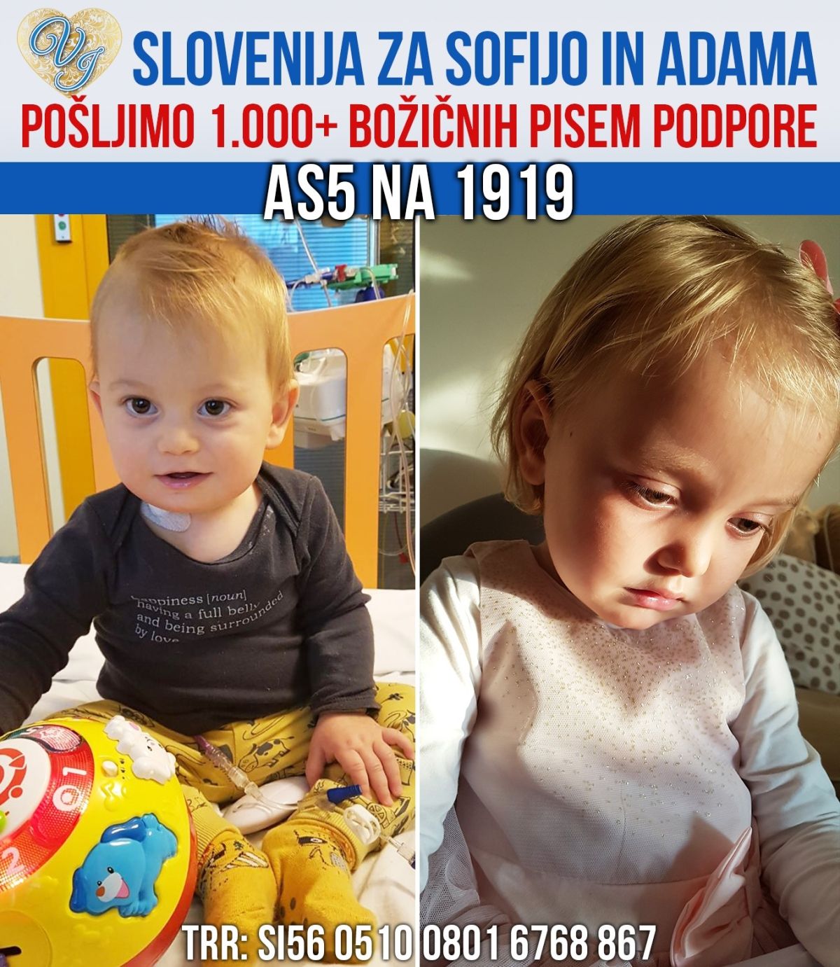 V Društvu Viljem Julijan prosijo za podporo deklici Sofiji, stari dve leti in pol, in njenemu devetmesečnemu bratcu Adamu, ki imata redko, hitro napredujočo nevrodegenerativno bolezen, metakromatsko levkodistrofijo. Pomagati jima je mogoče z nakazilom sredstev na TRR SI56 0510 0801 6768 867 in s SMS donacijami AS5 na številko 1919.