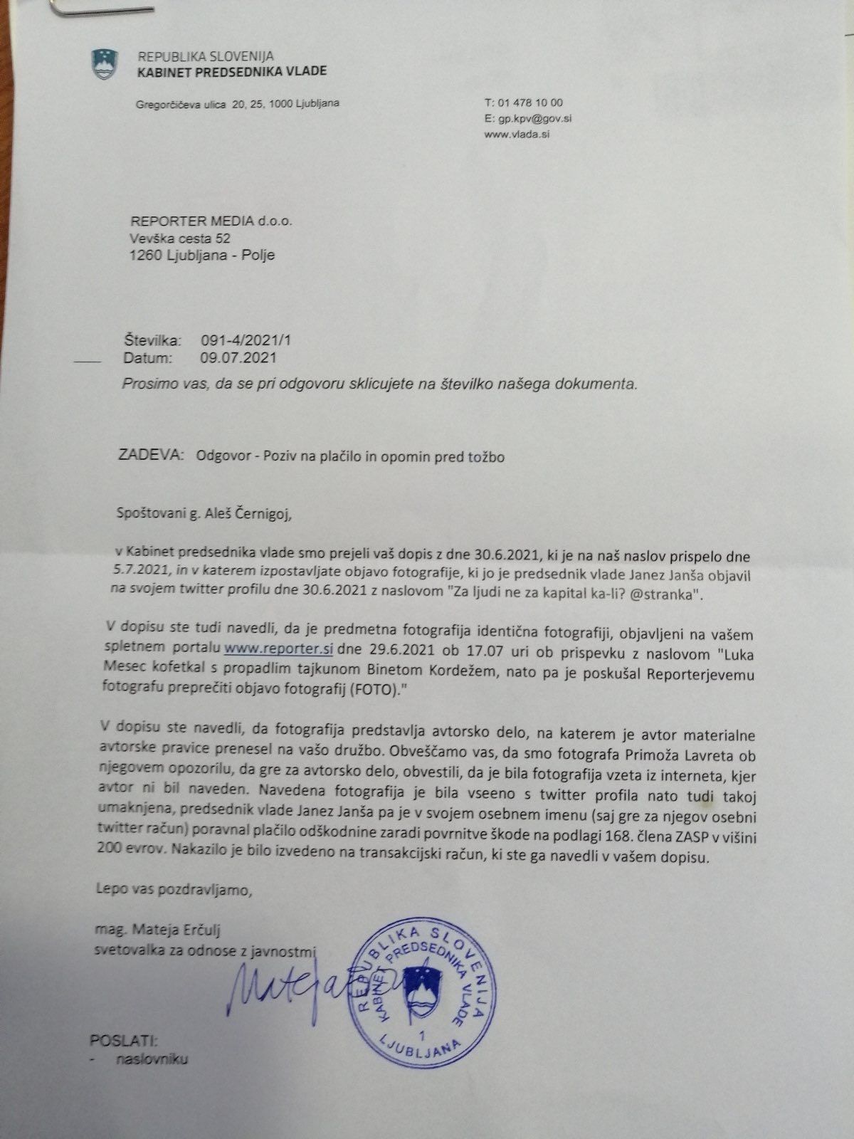 Na Reporterju se sprašujemo, ali gre morda za maščevanje predsednika vlade, ker mu je Reporter Media za objavo avtorske fotografije našega fotografa Primoža Lavreta na svojem tviter profilu brez navedbe in soglasja avtorja poslala poziv za plačilo in opomin pred tožbo.