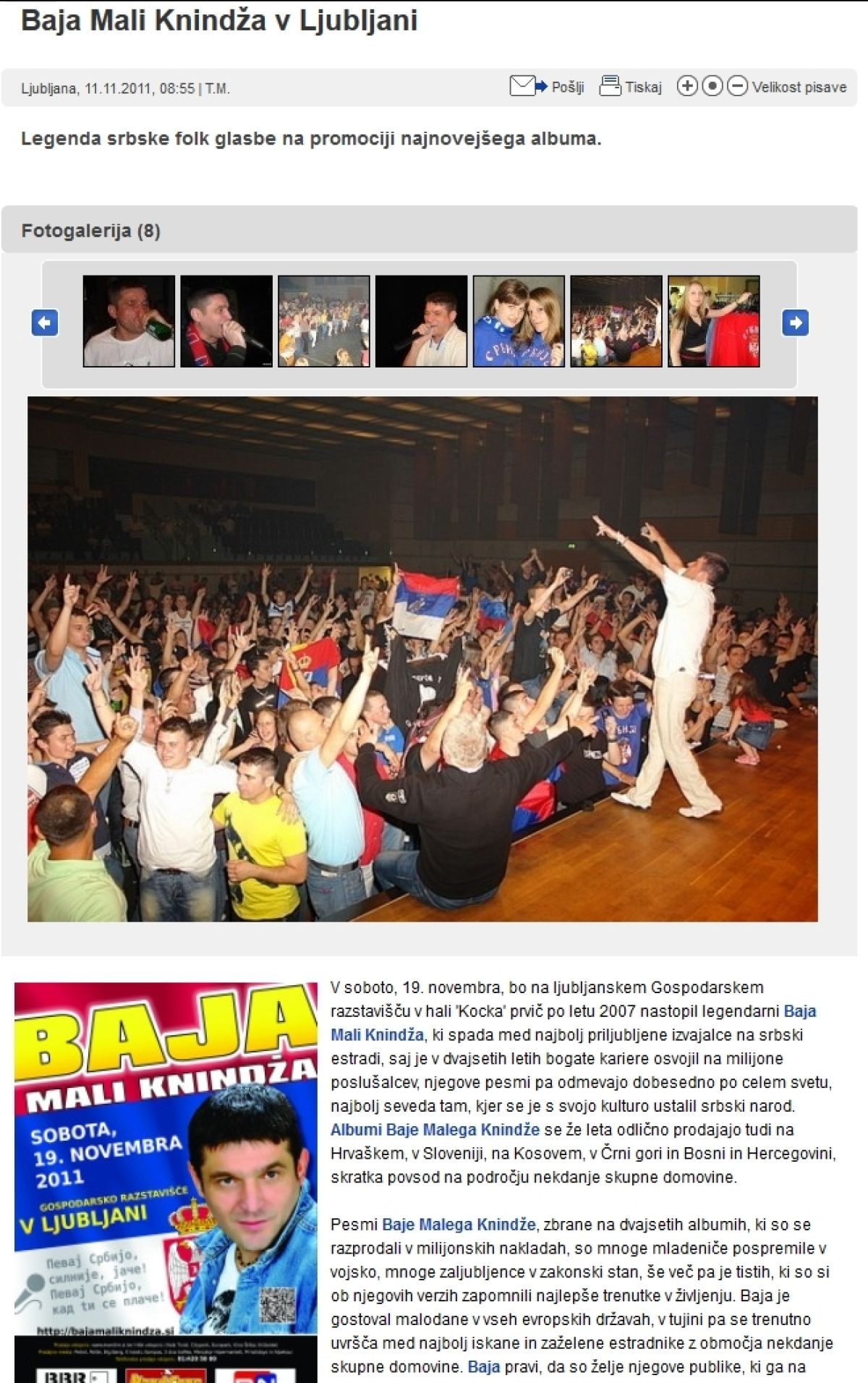 Na portalu 24ur.com so celo objavili plačani članek (oglas), da bo na ljubljanskem Gospodarskem razstavišču »prvič po letu 2007 nastopil legendarni Baja Mali Knindža, ki spada med najbolj priljubljene izvajalce na srbski estradi, saj je v dvajsetih letih bogate kariere osvojil na milijone poslušalcev, njegove pesmi pa odmevajo dobesedno po celem svetu, najbolj seveda tam, kjer se je s svojo kulturo ustalil srbski narod. Albumi Baje Malega Knindže se že leta odlično prodajajo, tudi na Hrvaškem, v Sloveniji, na Kosovem, v Črni gori in Bosni in Hercegovini, skratka povsod na področju nekdanje skupne domovine.«