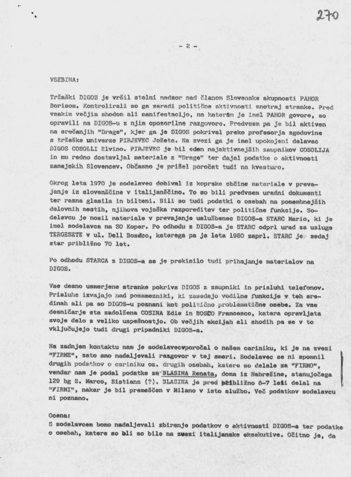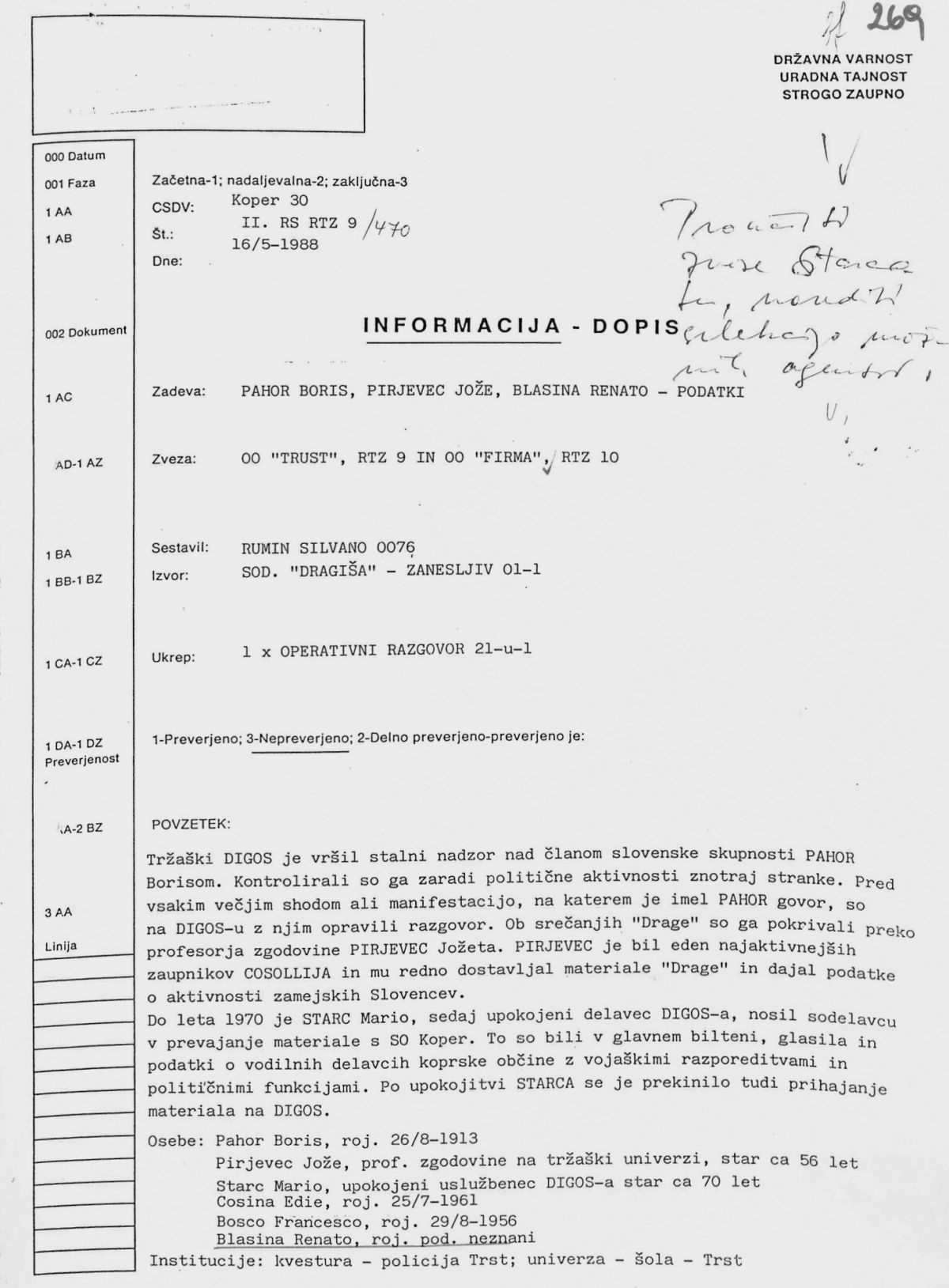 Tako je zanesljivi sodelavec Udbe Dragiša, bivši pripadnik italijanske policije, na operativnem pogovoru s koprskim udbovcem Silvanom Ruminom izjavil: »Tržaški DIGOS je vršil stalni nadzor nad članom slovenske skupnosti Pahor Borisom. Kontrolirali so ga zaradi politične aktivnosti znotraj stranke. Pred vsakim večjim shodom ali manifestacijo, na katerem je imel Pahor govor, so na Digosu z njim opravili razgovor. Ob srečanjih Drage so ga pokrivali preko profesorja zgodovine Pirjevec Jožeta. Na zvezi ga je imel upokojeni delavec DIGOS Cosoli Elvino. Pirjevec je bil eden najaktivnejših zaupnikov Cosolija in mu redno dostavljal materiale Drage in dajal podatke o aktivnostih zamejskih Slovencev. Občasno je prišel poročat tudi na kvesturo.«