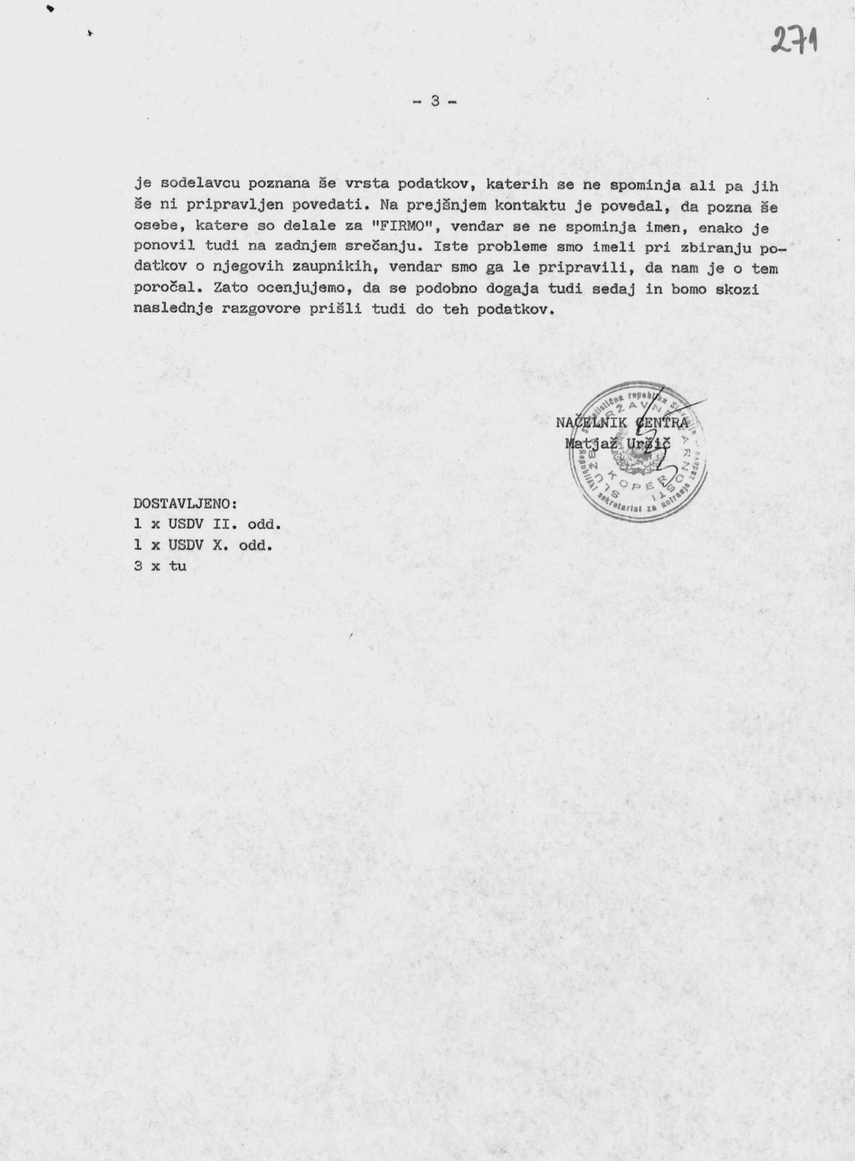 Ta zapis je objavljen na drugi strani tristranskega dokumenta, ki ga je podpisal načelnik centra SDV Koper Matjaž Uršič, na prvi strani pa je malce skrajšana ista vsebina. Kot piše Omerza v svoji najnovejši knjigi, je podobno zapisano tudi v obsežni udbovski študiji o tržaški kvesturi in Digosu iz avgusta 1989, v kateri Zoran Debeljak iz X. oddelka (analitika) SDV piše: »Pirjevec Jože, profesor zgodovine na tržaški univerzi. Bil je na zvezi Cosoli Elvina, med njegovimi najaktivnejšimi zaupniki, Preko njega je DIGOS zbiral informacije o članku SSk Borisu Pahorju in pokrival vsakoletno Drago, dajal pa jim je tudi informacije o dogodkih v Rižarni in v zvezi z bazoviškimi fojbami.«