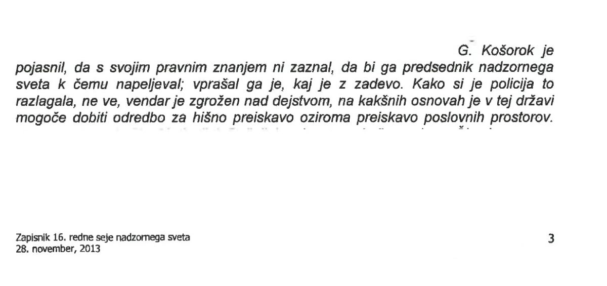 Kot dokaz prilagamo del zapisnika 16. redne seje Nadzornega sveta HSE, iz katerega je nedvoumno očitno in razvidno, kakšno je stališče g. Košoroka v zvezi s tem in njegovo zanikanje o kakršnih koli pritiskih s strani g. Zidanška nanj. Zahtevamo, da ta zapis objavite v luči celovite in objektivne informiranosti ter z njim seznanite svoje bralce. V nasprotnem primeru bomo primorani poseči tudi po drugih pravnih sredstvih.