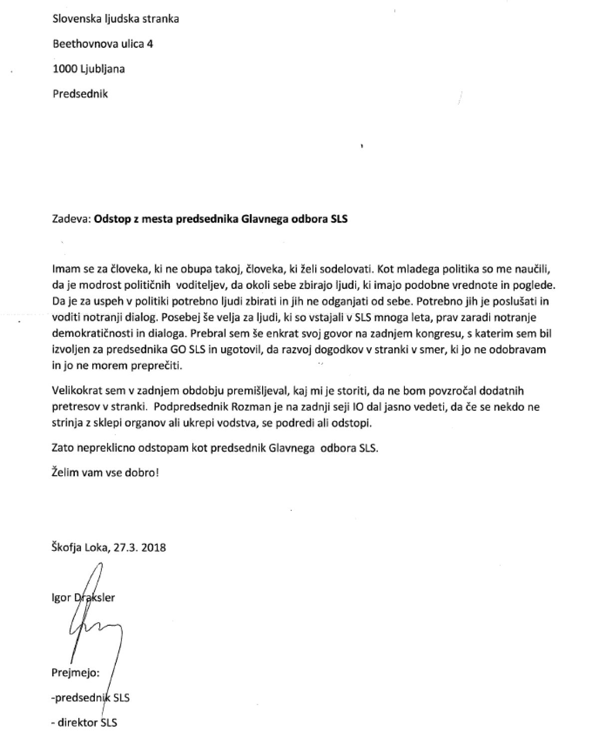 »Velikokrat sem v zadnjem obdobju premišljeval, kaj mi je storiti, da ne bom povzročal dodatnih pretresov v stranki. Podpredsednik Rozman je na zadnji seji IO dal jasno vedeti, da če se kdo ne strinja s sklepi organov ali ukrepi vodstva, se podredi ali odstopi. Zato nepreklicno odstopam kot predsednik Glavnega odbora SLS,« je zapisal Igor Draksler v izjavi, ki jo je poslal predsedniku Marku Zidanšku in direktorici Tadeji Romih.