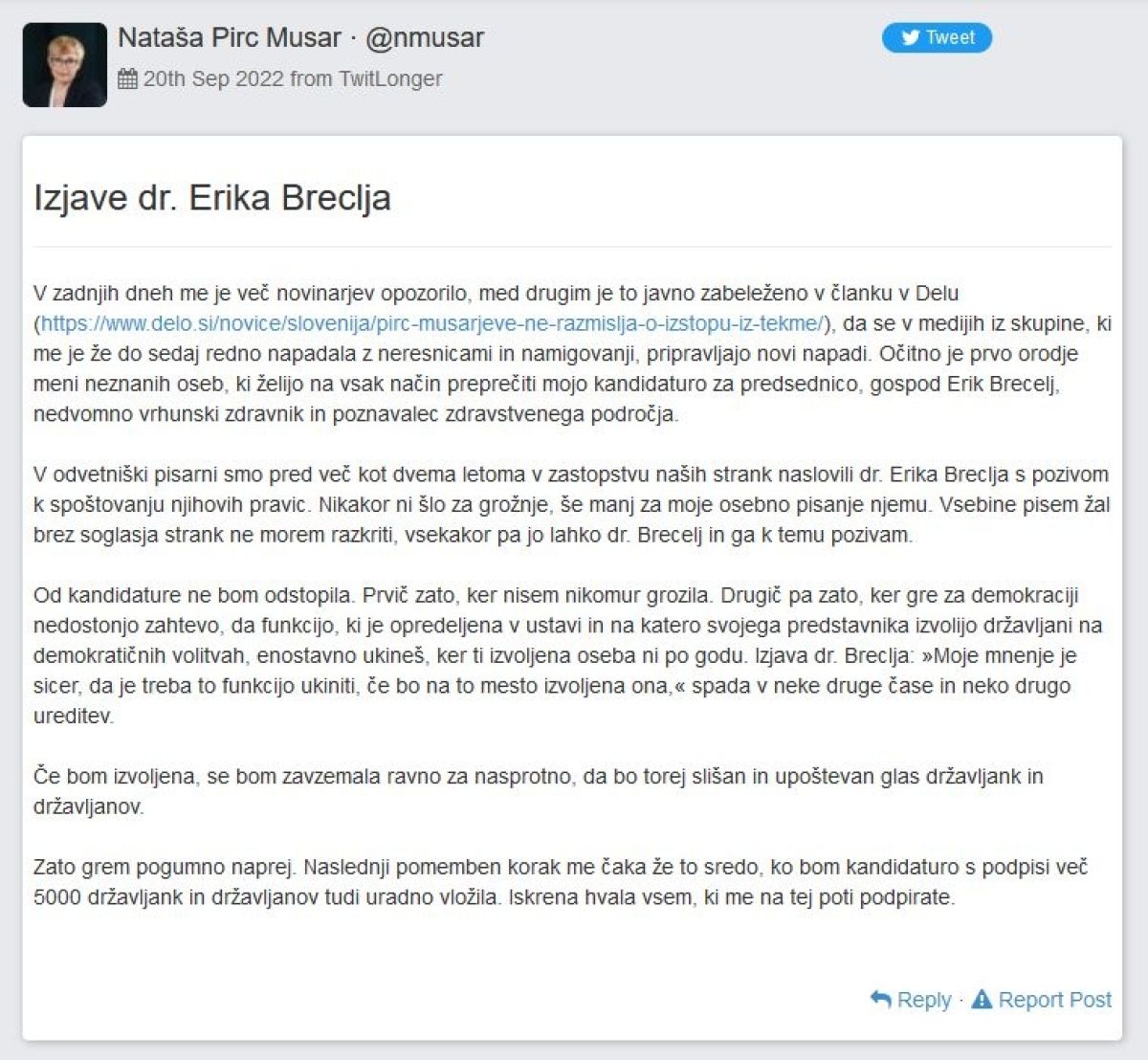 Piše tudi, da od kandidature ne bo odstopila in Breclju očita, da je orodje v rokah oseb, ki želijo preprečiti njeno kandidaturo za predsednico države.