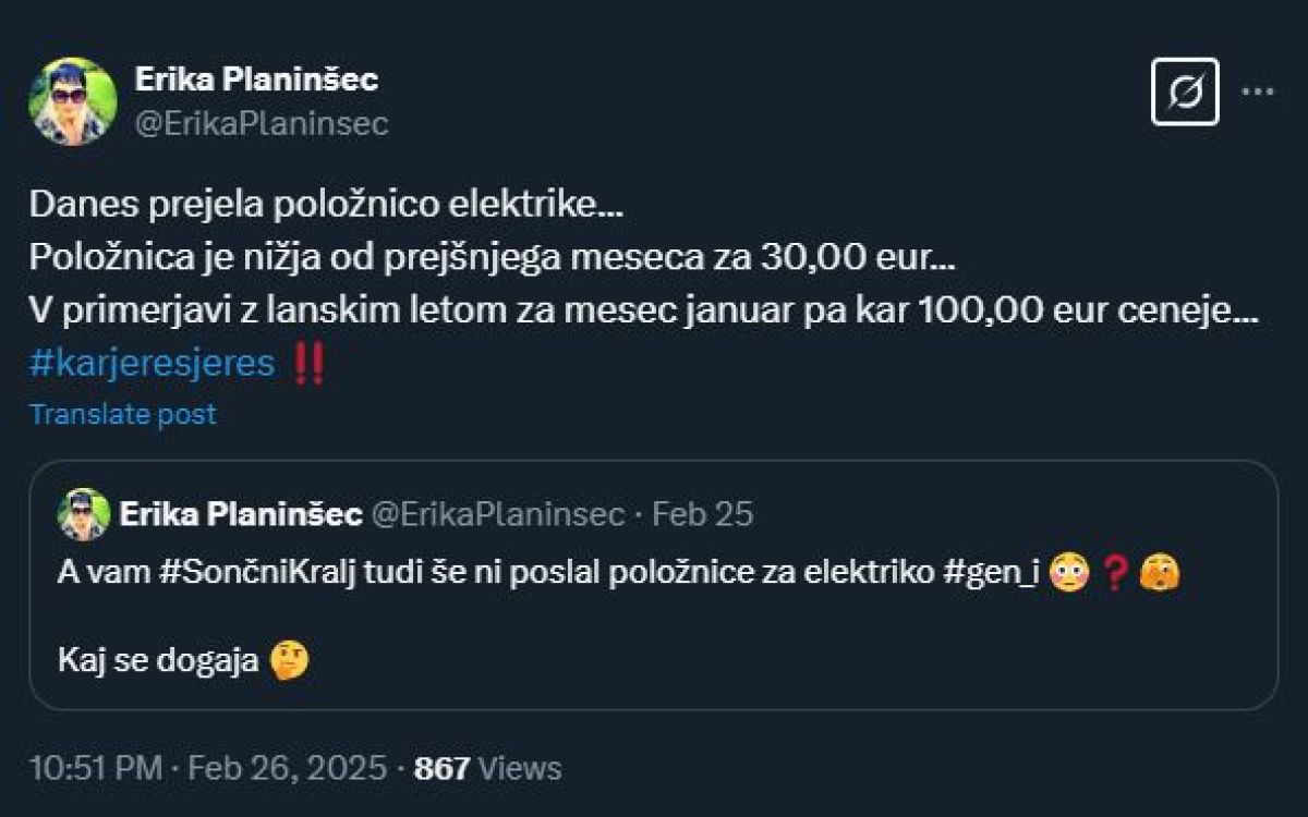 Da so se računi znižali, v teh dneh priznavajo tudi nekateri na desnici. »Danes prejela položnico elektrike... Položnica je nižja od prejšnjega meseca za 30,00 eur... V primerjavi z lanskim letom za mesec januar pa kar 100,00 eur ceneje... #karjeresjeres« je zapisala Erika Planinšec, ki sicer na omrežju X najpogosteje objavlja v podporo stranki SDS in njenemu prvaku Janezu Janši ter kritizira levico, še zlasti Golobovo vlado.