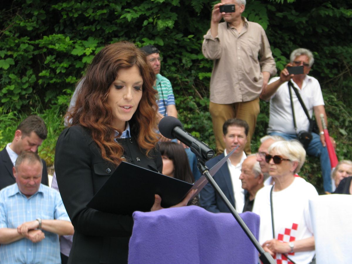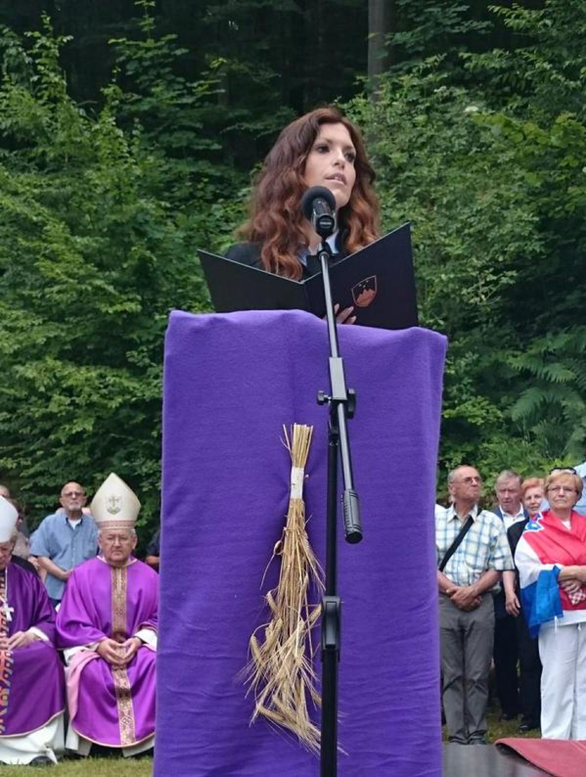 Osrednja govornica na slovesnosti po maši je bila predsednica parlamentarne komisije za peticije ter za človekove pravice in enake možnosti Eva Irgl, ki je med drugim dejala, da bo, dokler bo del politike zavestno ščitil morilce in potvarjal zgodovino v delu, ko govorimo o povojni moriji, težko graditi na iskreni skupni prihodnosti.