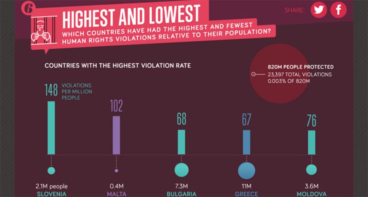Spletni portal Rights Info v analizi povzetka dokumenta ESČP ugotavlja, da je Slovenija s 148 primeri ugotovljenih kršitev človekovih pravic na milijon prebivalcev prva med evropskimi državami. Sledijo Malta s 102 kršitvama na milijon prebivalcev, Moldavija (76), Bolgarija (68) in Grčija (67). Najmanj kršitev človekovih pravic na milijon prebivalcev beležijo Španija (2), Nemčija (2), Danska (3), Irska (5) in Velika Britanija (5).