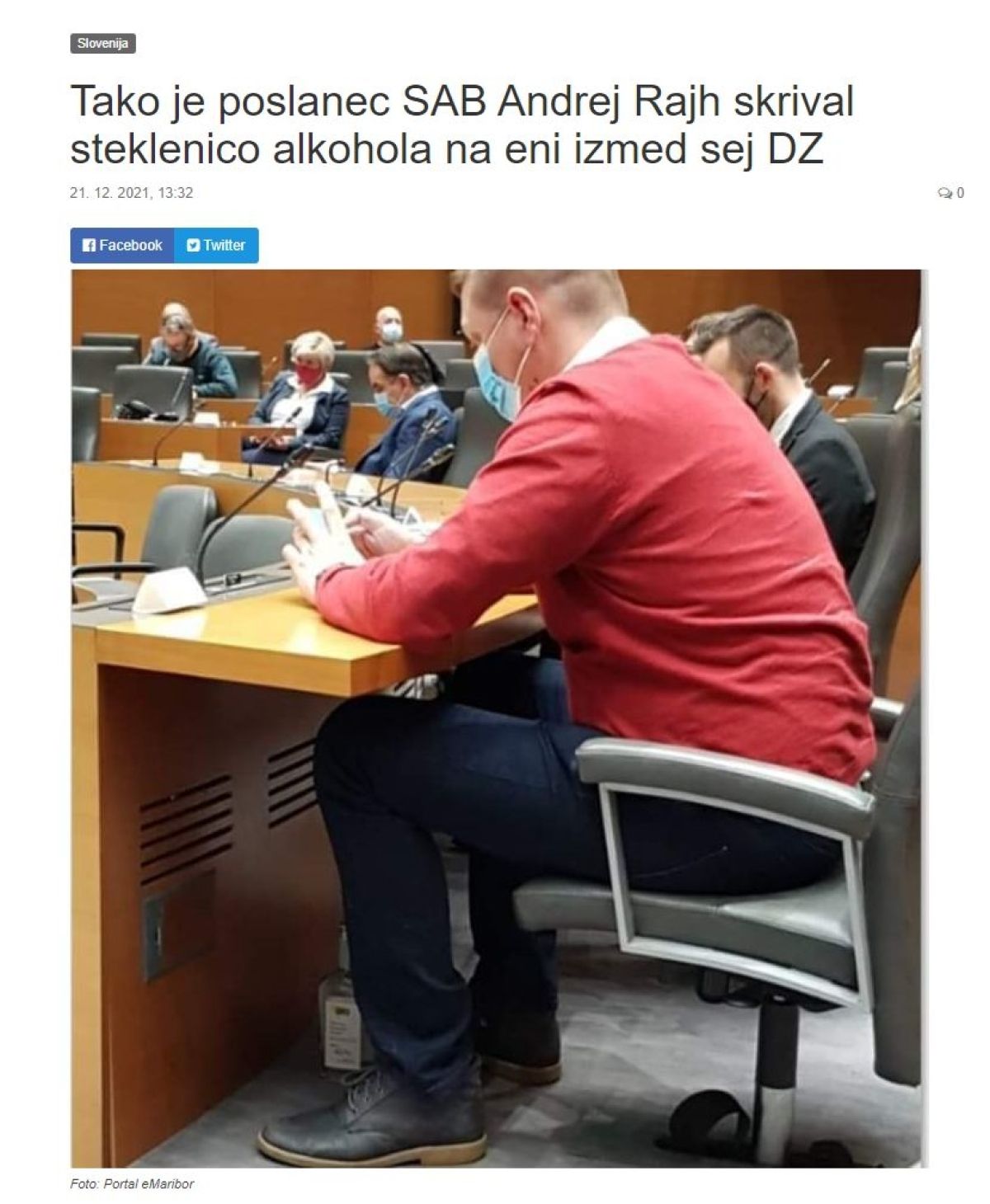 Portal Nova24 je objavil fotografijo poslanca SAB Andreja Rajha s steklenico alkohola pod mizo v dvorani državnega zbora. Češ: ministra Aleša Hojsa napadajo, ker med sejo je arašide, a poglejte, kaj si privošči poslanec KUL.