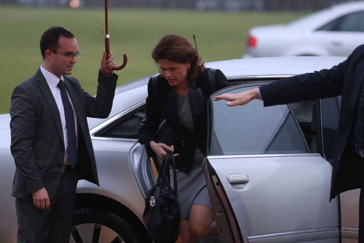 Prva je na Brdo prispela premierka Alenka Bratušek, kot zadnji pa prvak SD Igor Lukšič s piarovcem Denisom Sarkićem v vlogi nosilca dežnika.