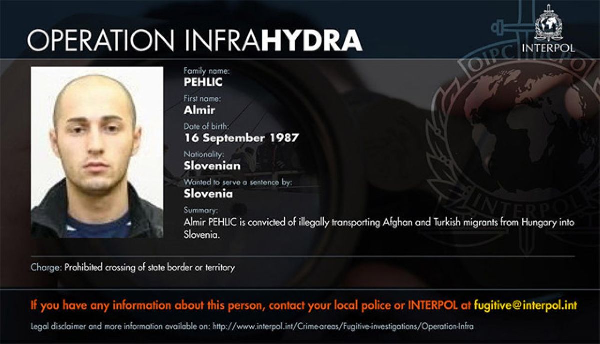Interpol je včeraj javnost pozval k pomoči pri iskanju 123 tihotapcev ljudi. Med njimi je tudi slovenski državljan, ki je v Sloveniji obsojen prepovedanega prehajanja meje ali ozemlja države, so za STA potrdili pri slovenski policiji. Almir Pehlić je namreč obtožen nezakonitega tihotapljenja turških in afganistanskih migrantov iz Madžarske v Slovenijo.