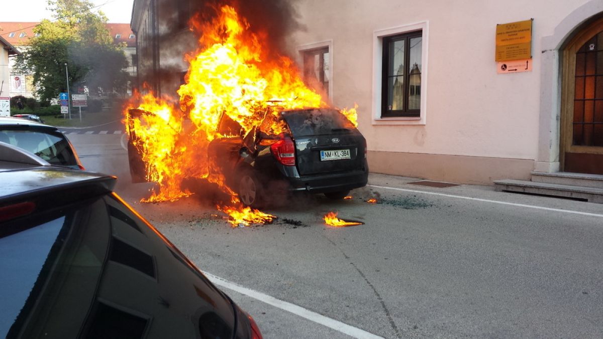 FOTO: V centru Novega mesta zgorel avtomobil; voznik hudo poškodovan