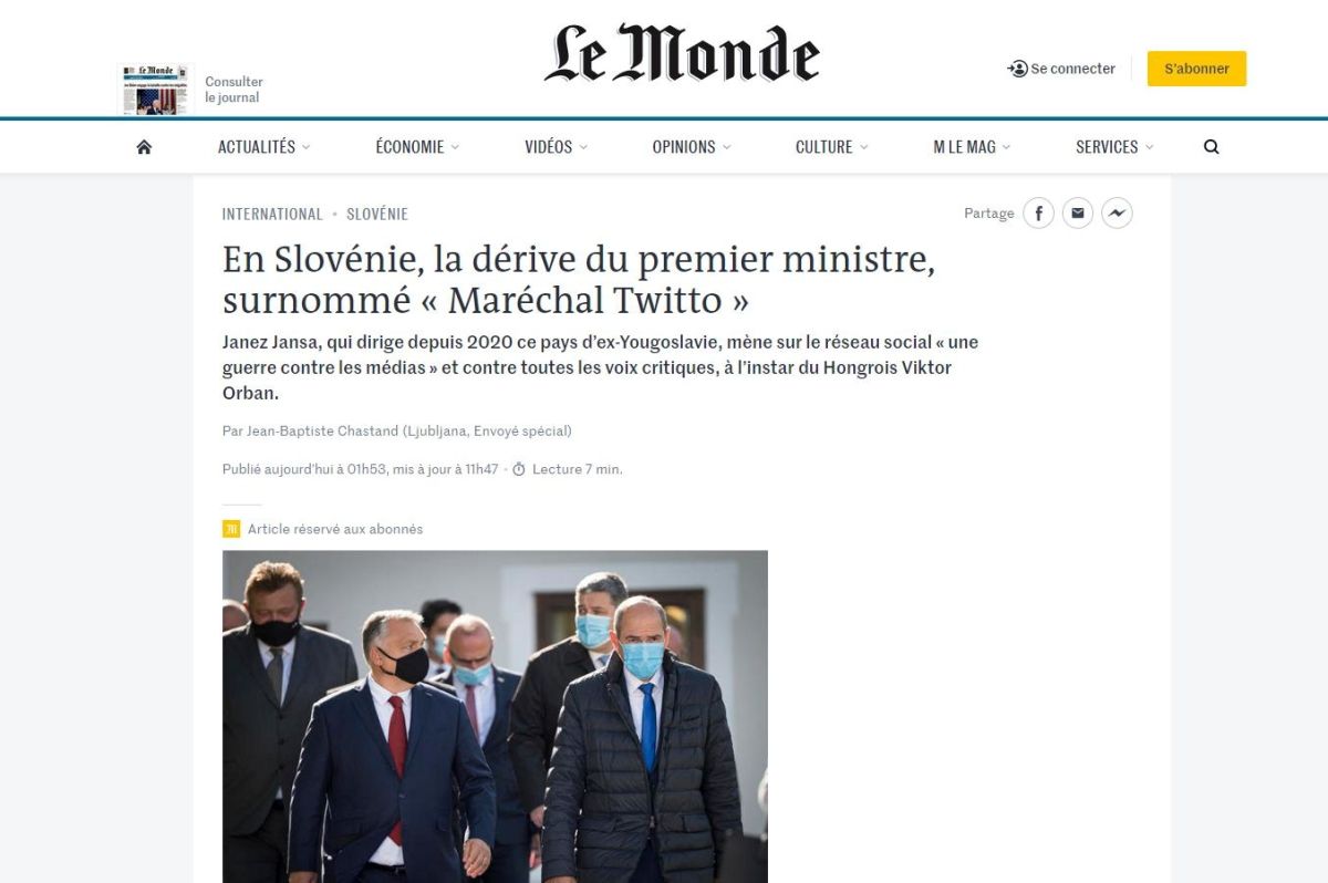 Ugledni francoski časnik Le Monde je danes objavil obsežen članek o slovenskem premierju Janezu Janši, ki ga bo danes v Elizejski palači sprejel francoski predsednik Emmanuel Macron. Kot piše časnik, Janša, ki se ga prijel vzdevek maršal Twitto, na Twitterju vodi vojno proti medijem in vsem kritičnim glasovom.