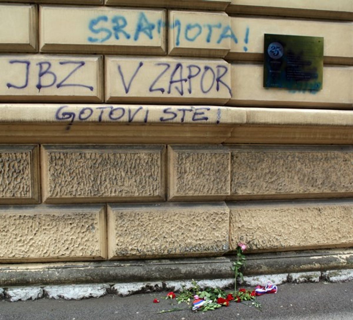 Na grafitih piše: "Korupcija. Gotovi ste. 25. 6. 2013 JBZ v zapor. Sramota. Lopovi."