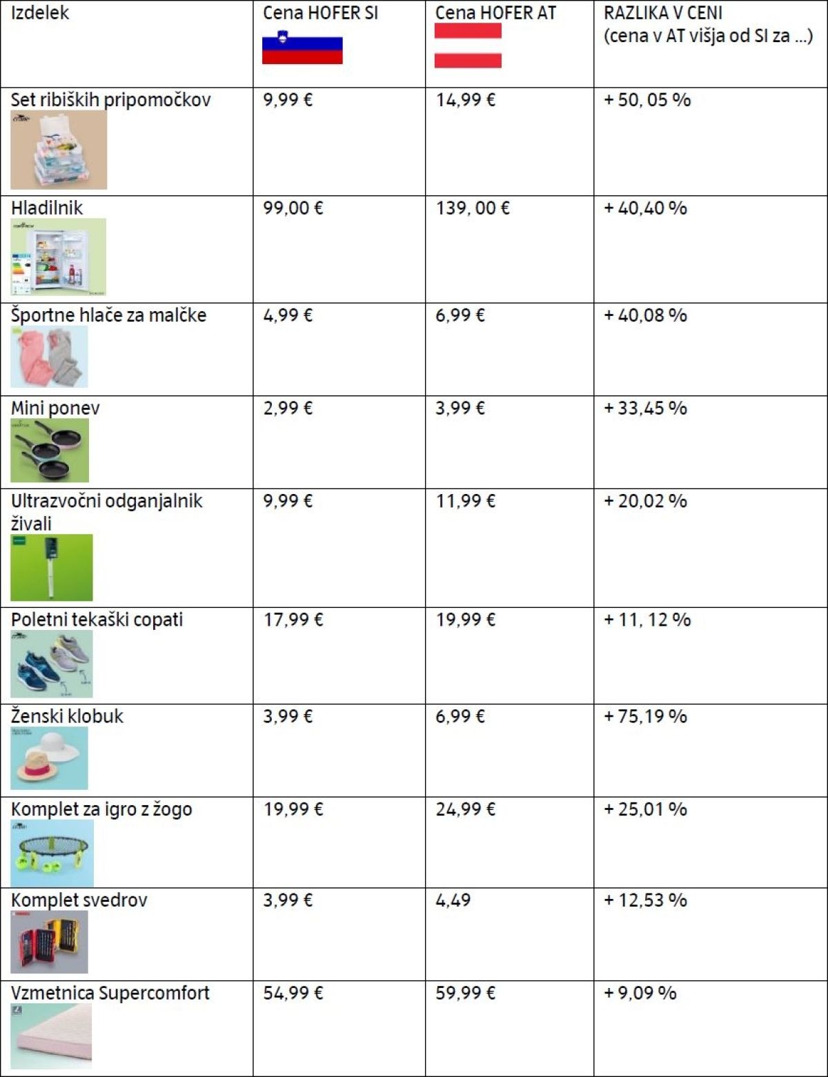 »Nemški veletrgovec Hofer številne izdelke v Sloveniji prodaja dražje, kot jih kupcem v sosednji Avstriji. Nekdanji novinar TV Slovenija Borut Janc, ki zdaj živi na Dunaju, je na Twitterju objavil primerjavo cen določenih izdelkov iz kazalogov, ki jih Hofer ponuja v obeh državah, a so v Sloveniji dražji.