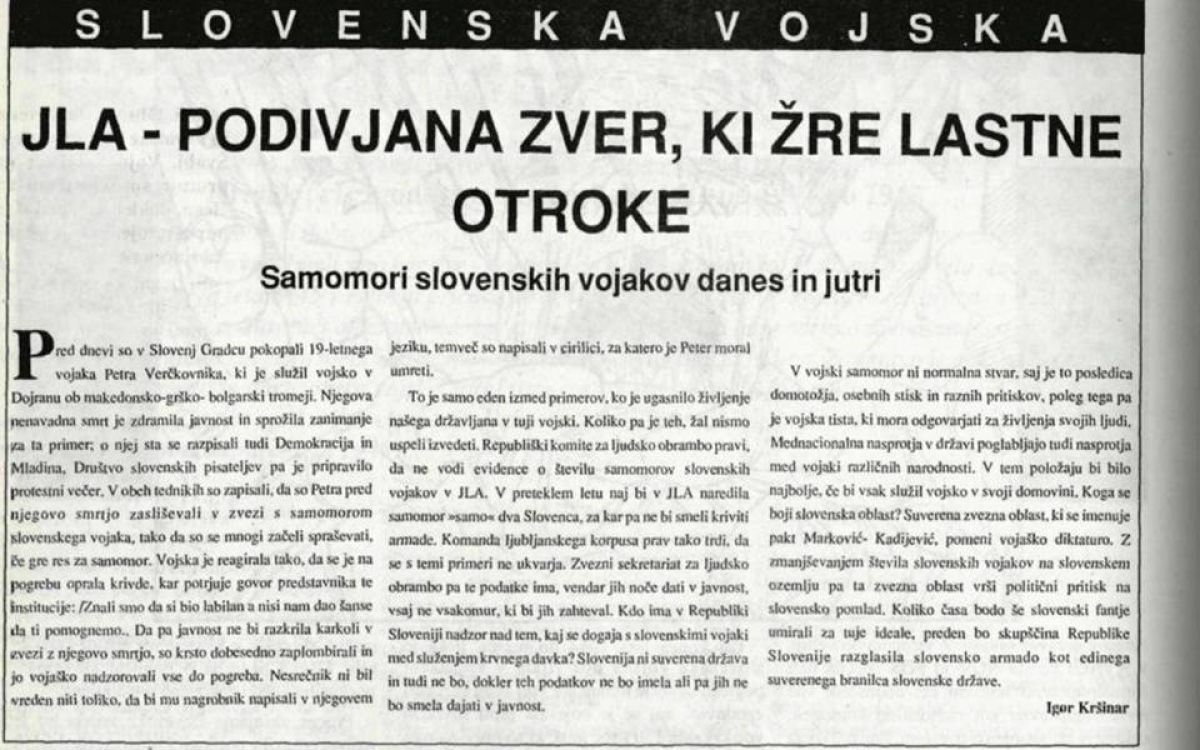 V takratnem obdobju sem pisal tudi članek o samomorih slovenskih vojakov v takratni JLA z naslovom »JLA – podivjana zver, ki žre lastne otroke«, kjer sem se zavzel za slovensko armado.