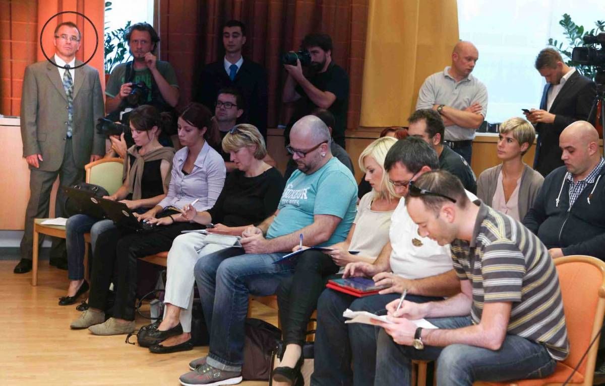 Varnostnik (na fotografiji skrajno levo) premierja Mira Cerarja je sinoči grozil novinarkam in novinarskim ekipam RTV Slovenija, STA in Planet TV, ki so v Ljubljani pred sedežem Stranke Mira Cerarja čakale na konec sestanka IO stranke. Novinarka Radia Slovenije je tudi čakala na dr. Milana Brgleza, s katerim je bila dogovorjena za izjavo po koncu seje.