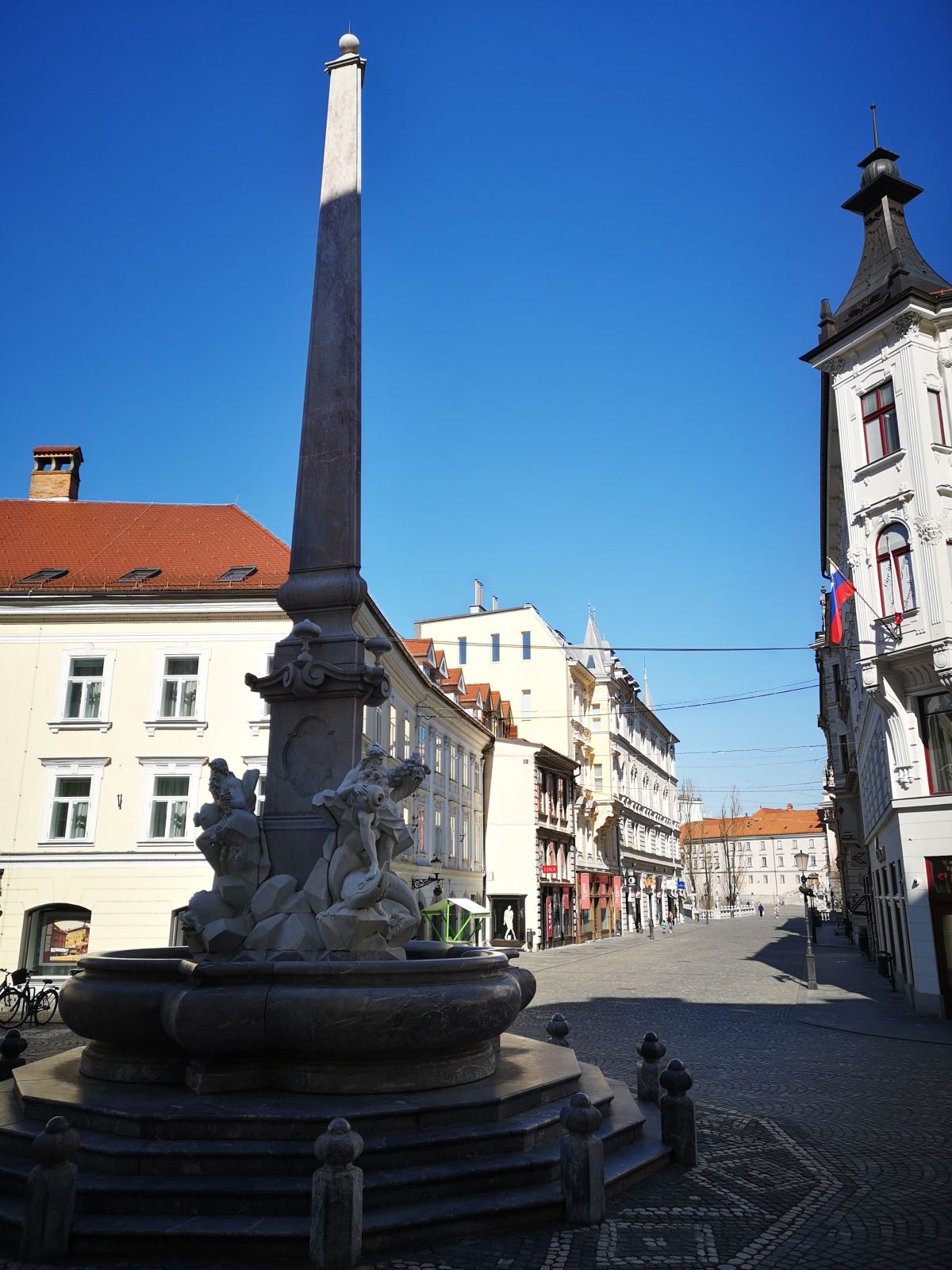 Tudi vedno živahna ulica, ki pelje mimo tržnice do stolnice in naprej do Robovega vodnjaka in mestne hiše je skoraj povsem prazna. Občutek dobimo, da se še golobi držijo bolj vsak k sebi kot je navada pri teh ptičih. Ljudi skoraj ni na mestnih ulicah. Lahko pa občudujemo Robov vodnjak in pogled proti Prešernovem trgu v taki spokojnosti, kot je za Ljubljano nepredstavljiva.