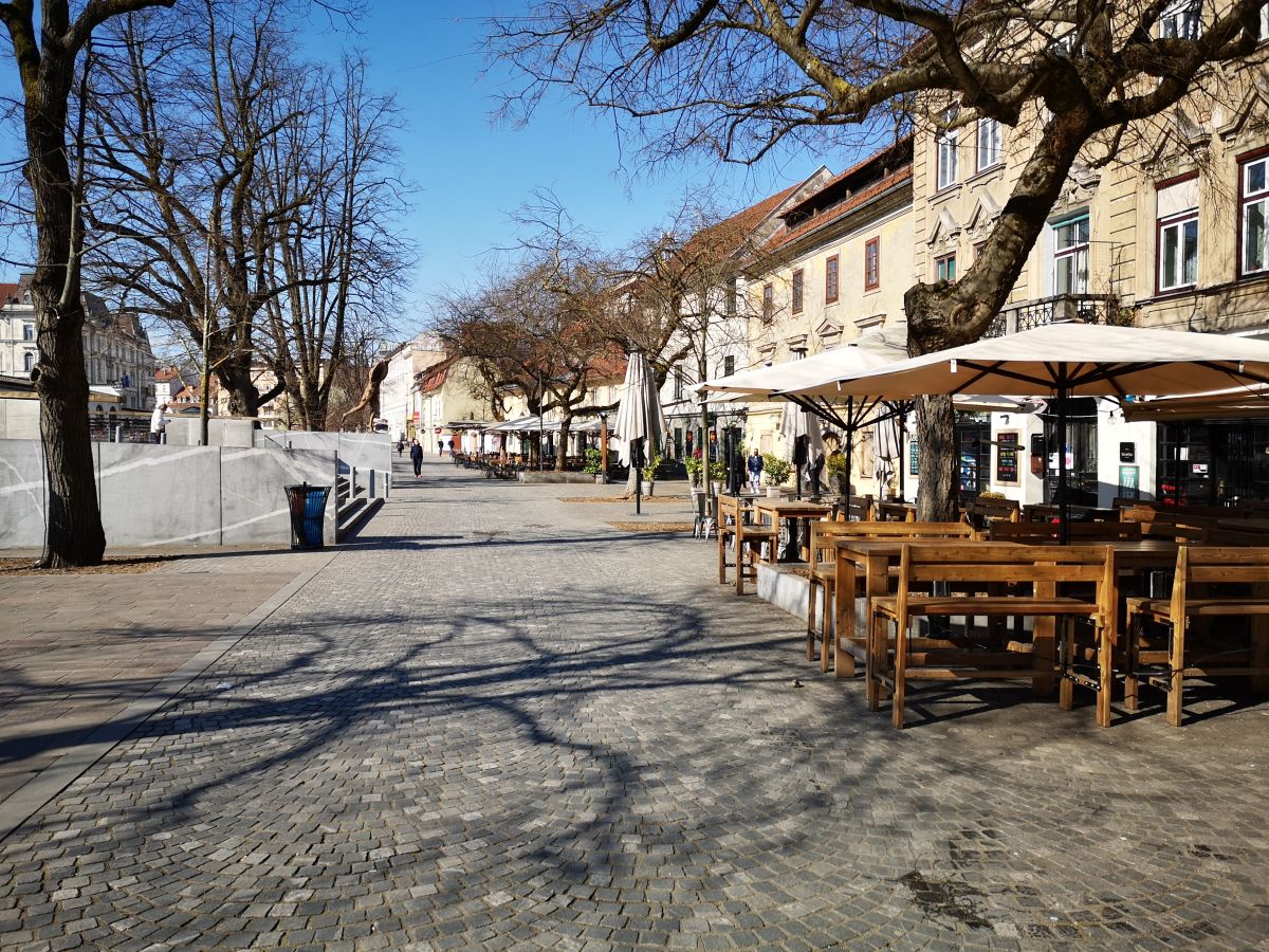 Trubarjeva ulica sameva. Eden najstarejših lokalov na tej lokaciji zaprt. Gremo naprej. Proti Petkovškovem nabrežju, kjer v sončnih dnevih čakate na kak prost stol ali mizo. Danes nikjer žive duše, z izjemo klošarja, ki s pločevinko piva pri glavi v miru počiva na betonski klopici ob Ljubljanici. Pot nas pelje naprej do Tromostovja. Nekaj ljudi, ki hitijo eden mimo drugega, brez ustavljanja in bežnih pozdravov ali čvekov kot ponavadi.