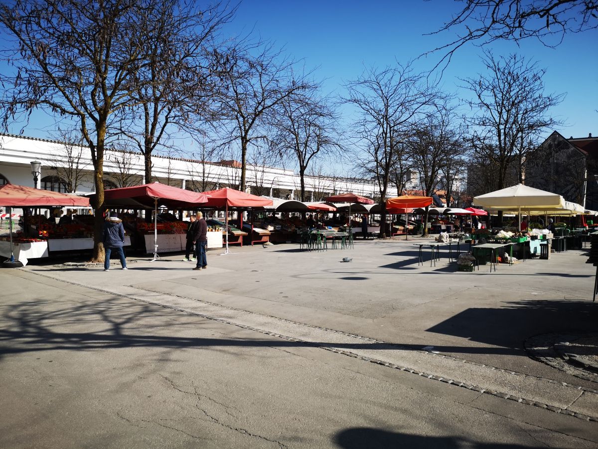 Zavijemo na tržnico. Bistveno manj branjevcev kot sicer. Nekaj besed spregovorimo s prodajalcem, ki že zdaj prodaja breskve, marelice in češnje (iz uvoza). Kako to, da prodaja? Pojasni nam, da se v Ljubljani kljub temu, da ima odprto stojnico počuti bistveno manj ogrožen zaradi koronavirusa kot v rodni Banjaluki. »Tu vsaj vem pri čem sem,« poudari. Sicer pa stojnice po večini samevajo.