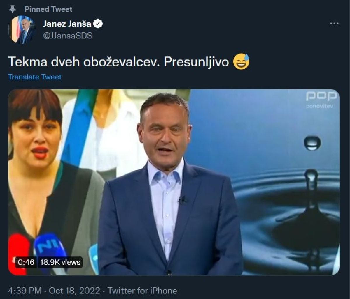 »Tekma dveh oboževalcev. Presunljivo,« je Janša tvitnik ob videu, s katerim je namignil, da sta sogovornika obsedena z njim. Glede na to, kako pozorno spremlja svoje omembe v medijih, se lahko vprašamo, ali je sam obseden s pozornostjo, ki jo je deležen v javnosti.