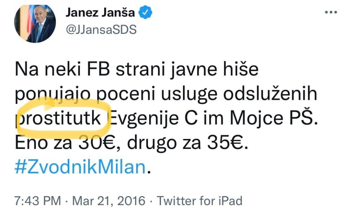 V tvitu 21. marca 2016 je povsem jasno napisal: »Na neki FB strani javne hiše ponujajo poceni usluge odsluženih prostitutk Evgenije C in Mojce PŠ. Eno za 30€, drugo za 35€.«