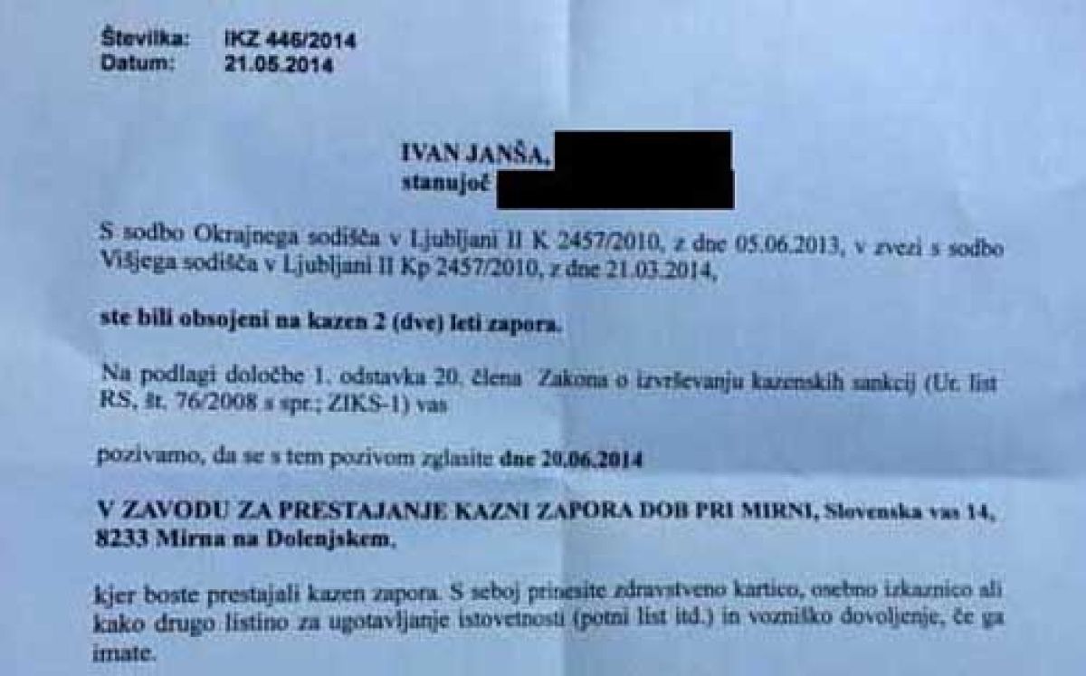 Če se na omenjeni datum Janša ne bo zglasil na Dobu, bo odrejena prisilna privedba na njegove stroške na podlagi zakona o izvrševanju kazenskih sankcij, še piše v pozivu na prestajanje zaporne kazni.