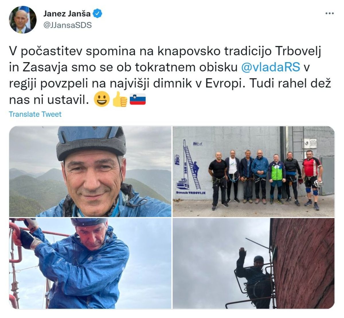 »V počastitev spomina na knapovsko tradicijo Trbovelj in Zasavja smo se ob tokratnem obisku vlade v regiji povzpeli na najvišji dimnik v Evropi. Tudi rahel dež nas ni ustavil,« se po tviterju hvali premier Janez Janša.
