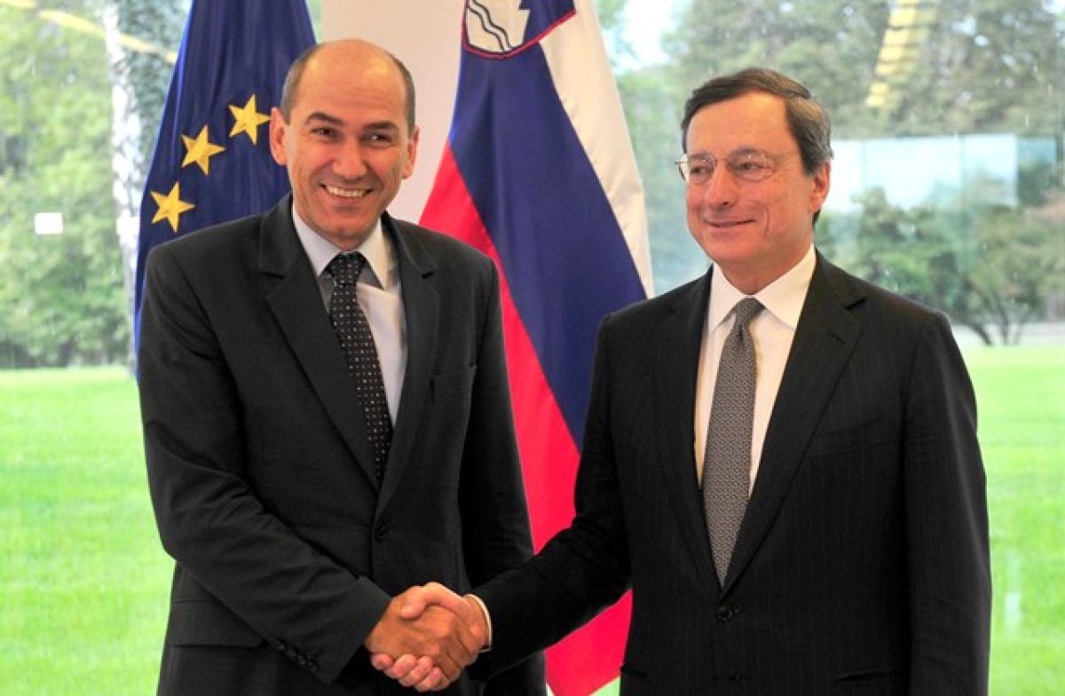 Predsednik vlade Janez Janša se je včeraj na Brdu pri Kranju sestal s predsednikom Evropske centralne banke (ECB) Mariom Draghijem. Govorila sta o razmerah v območju evra in ukrepih, ki jih namerava Slovenija izvesti do konca leta, da bi izšla iz nevarnih voda, je v izjavi za medije povedal Janša.