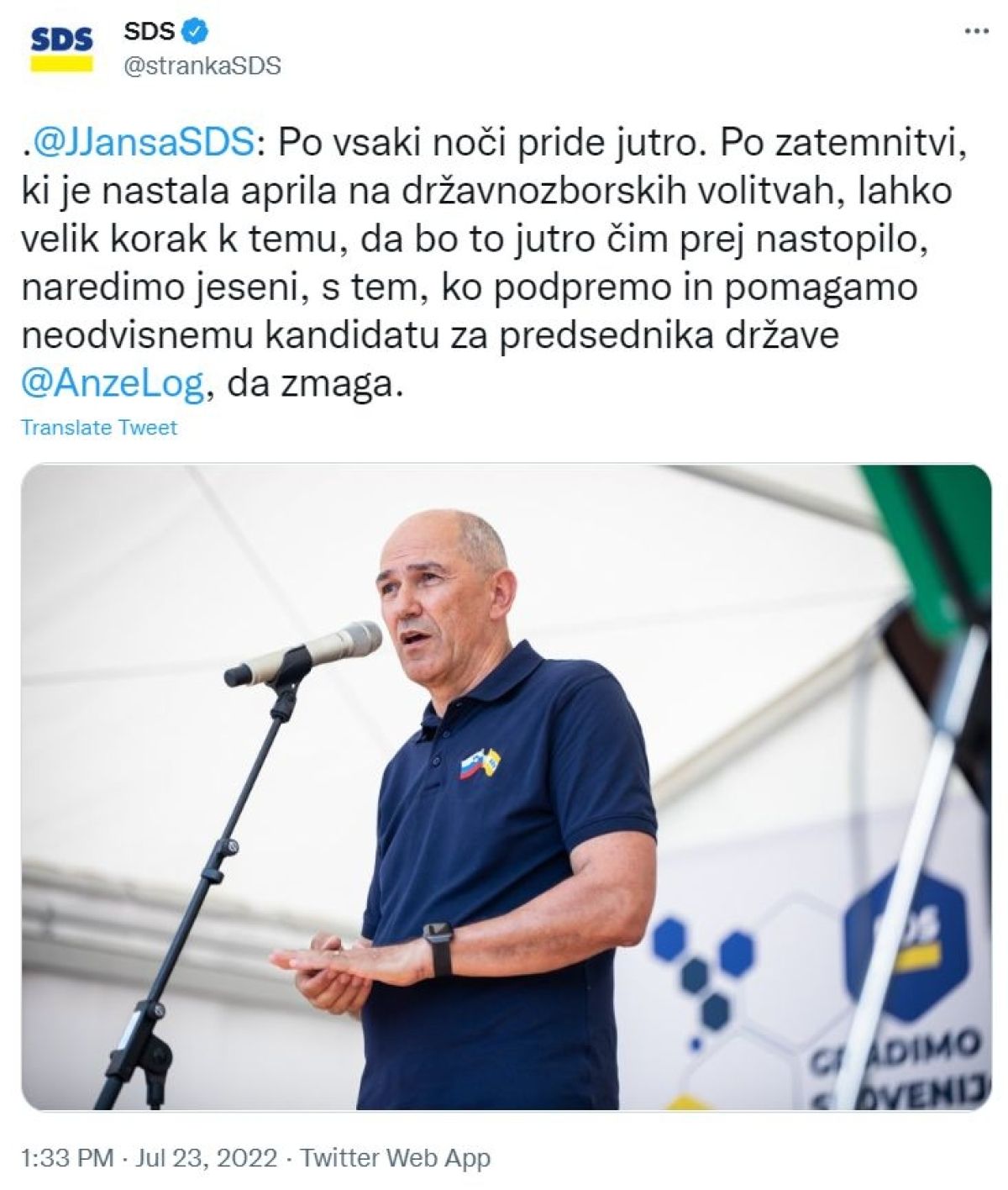 "Pravijo, da po vsaki noči pride jutro, da se še nikoli ni zgodilo, da po noči ne bi prišlo jutro. Torej po tej zatemnitvi, ki je nastala aprila na državnozborskih volitvah, mislim, da lahko velik korak k temu, da bo to jutro čim prej nastopilo, naredimo jeseni s tem, ko podpremo in pomagamo Anžetu Logarju, da zmaga," je pozval. Nekdanji zunanji minister in poslanec SDS Logar je že napovedal kandidaturo na predsedniških volitvah.