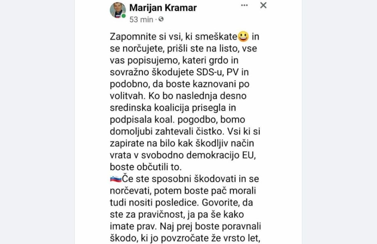 Ljutomerčan Marijan Kramar (ne gre za bivšega predsednika uprave NLB) je na facebooku objavil precej žolčen komentar kot odziv na vse, ki se norčujejo ali sovražno škodujejo stranki SDS in predsedniku vlade Janezu Janši. Vse vas popisujemo, »da boste kaznovani po volitvah«, sporoča Kramar.