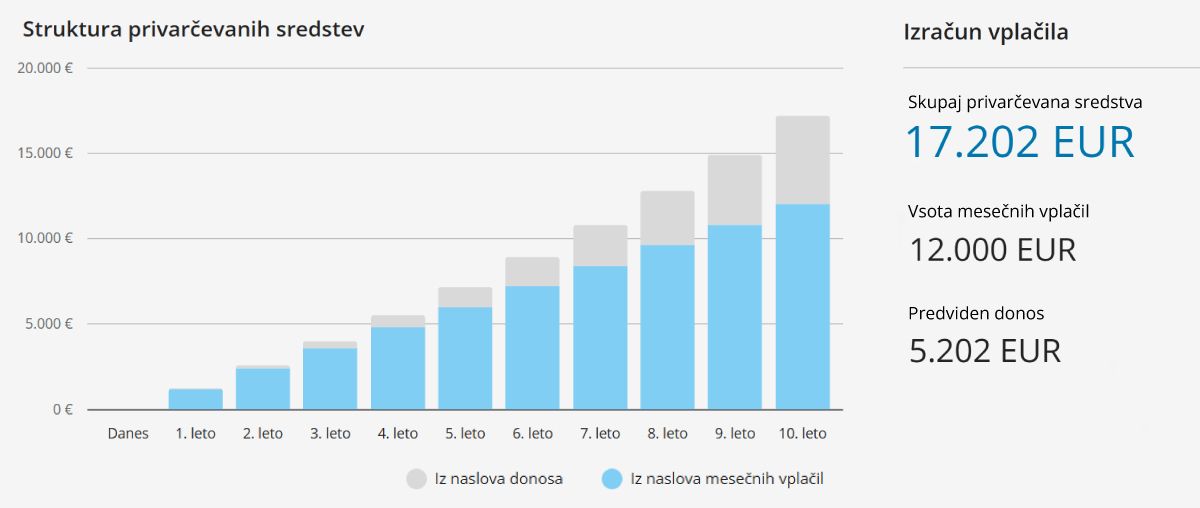 Vir: Vlagateljski kalkulator Triglav Investments. Mesečno vplačilo: 100 evrov. Predvideni letni donos: 7 %. Čas varčevanja: 10 let.