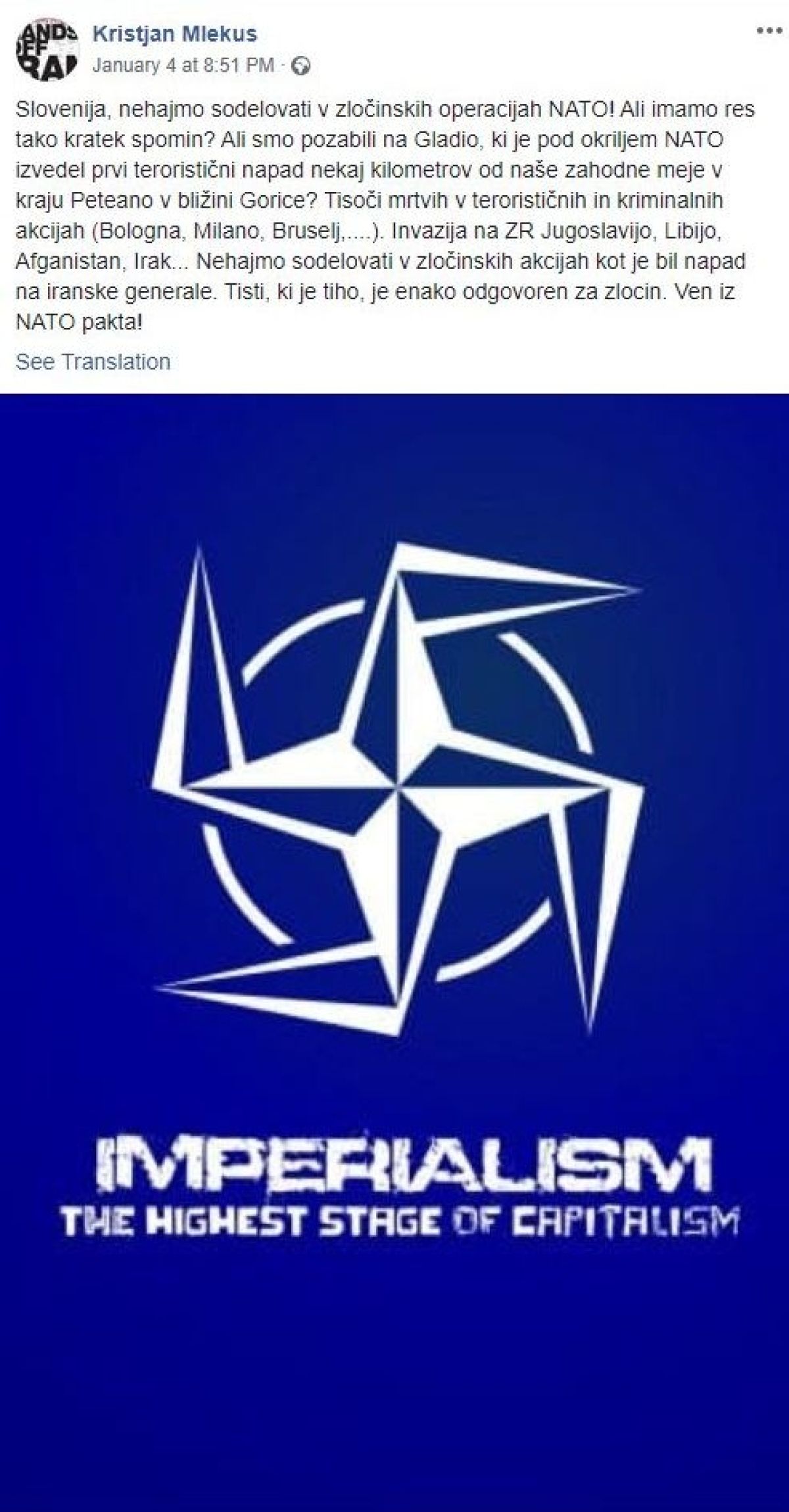»Slovenija, nehajmo sodelovati v zločinskih operacijah NATO! Ali imamo res tako kratek spomin? Ali smo pozabili na Gladio, ki je pod okriljem NATO izvedel prvi teroristični napad nekaj kilometrov od naše zahodne meje v kraju Peteano v bližini Gorice? Tisoči mrtvih v terorističnih in kriminalnih akcijah (Bologna, Milano, Bruselj,....). Invazija na ZR Jugoslavijo, Libijo, Afganistan, Irak... Nehajmo sodelovati v zločinskih akcijah kot je bil napad na iranske generale. Tisti, ki je tiho, je enako odgovoren za zločin. Ven iz NATO pakta!« je zapisal Mlekuš.