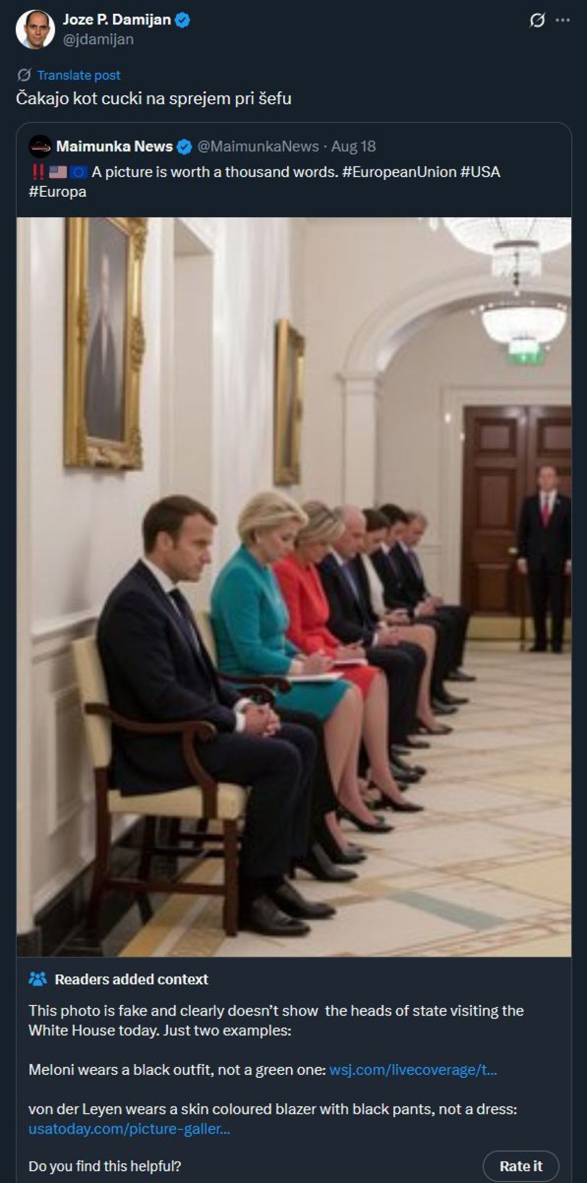 »Čakajo kot cucki na sprejem pri šefu,« je zapisal Damijan, ki je delil objavo protievropske in proruske propagande, čeprav je bila ta že jasno označena kot potvorba, narejena z umetno inteligenco.