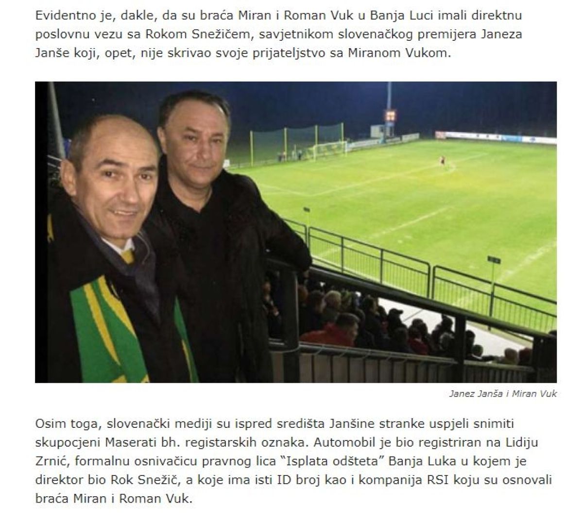 Istraga.ba je objavila fotografijo, na katero sta skupaj Janša in Vuk, omenja pa tudi avtomobil znamke maserati bosanske registracije, s katerim se je pred sedežem SDS pripeljal Snežič: »Avtomobil je bil registriran na Lidijo Zrnić, formalno ustanoviteljico pravne osebe Izplata ošteta Banja Luka, kjer je bil direktor Rok Snežič in ima isto ID številko kot podjetje RSI, ki sta jo ustanovila brata Miran in Roman Vuk.«