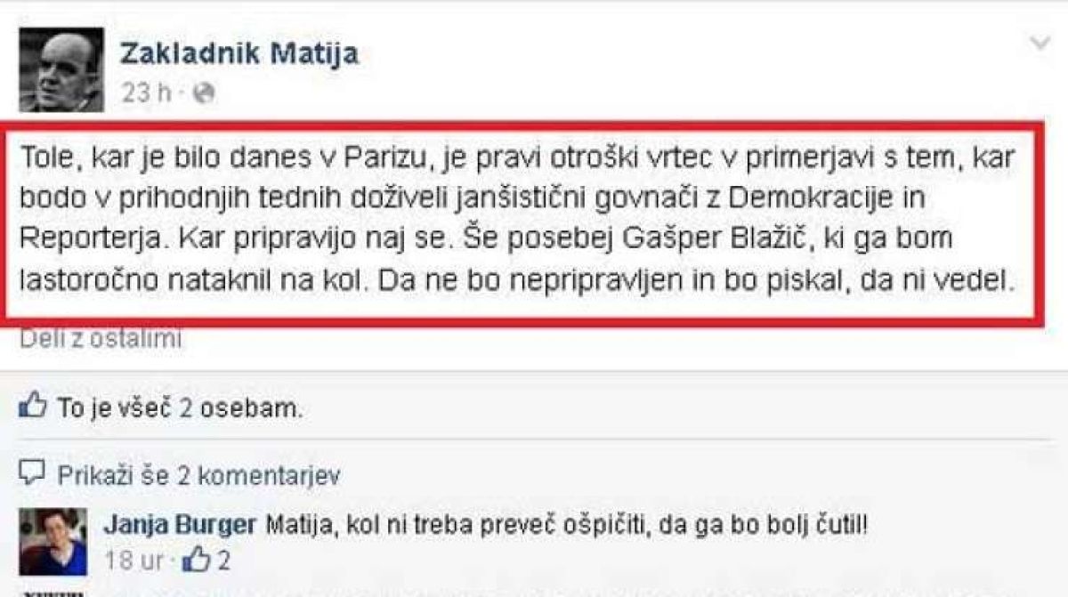 Sedmega januarja 2015, na dan grozljivega islamističnega pokola novinarjev pariškega satiričnega tednika Charlie Hebdo, je neznanec pod profilom »zakladnik Matija« na omrežju facebook zapisal, da je bil pokol v Parizu zgolj otroški vrtec v primerjavi s tem, kar bomo v prihodnjih tednih doživeli novinarji z Reporterja in Demokracije ter naj se kar pripravimo.