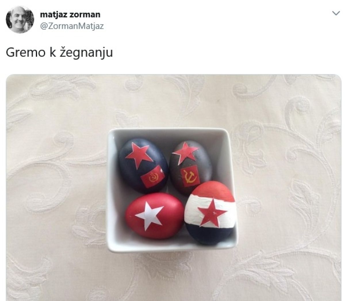 »Gremo k žegnanju,« je 3. aprila 2015 tvitnil Matjaž Zorman in priložil fotografije pirhov s srpom in kladivom, rdečo zvezdo in zastavo propadle komunistične Jugoslavije. S tem se je norčeval ne le iz največjega krščanskega praznika, ampak tudi iz žrtev komunizma.
