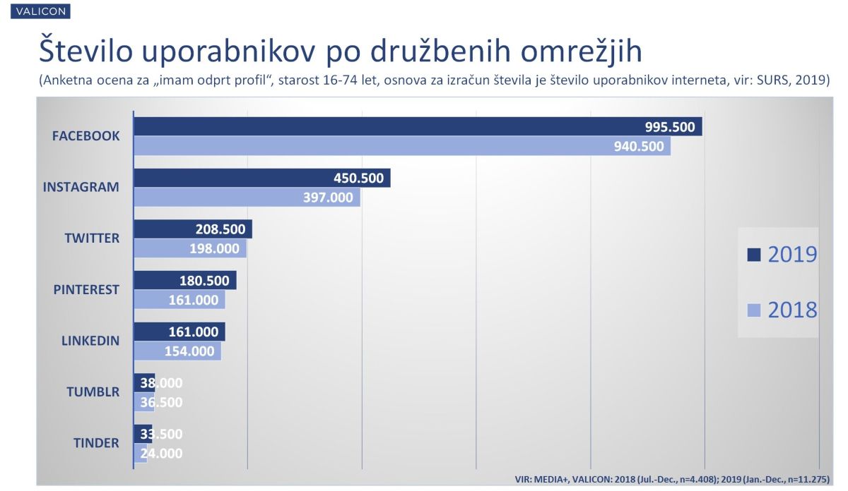 Največ uporabnikov ima Facebook - skoraj milijon prebivalcev Slovenije ima svoj profil na tem omrežju, najhitreje pa raste omrežje Instagram, na katerem ima svoj profil 450.000 prebivalcev Slovenije