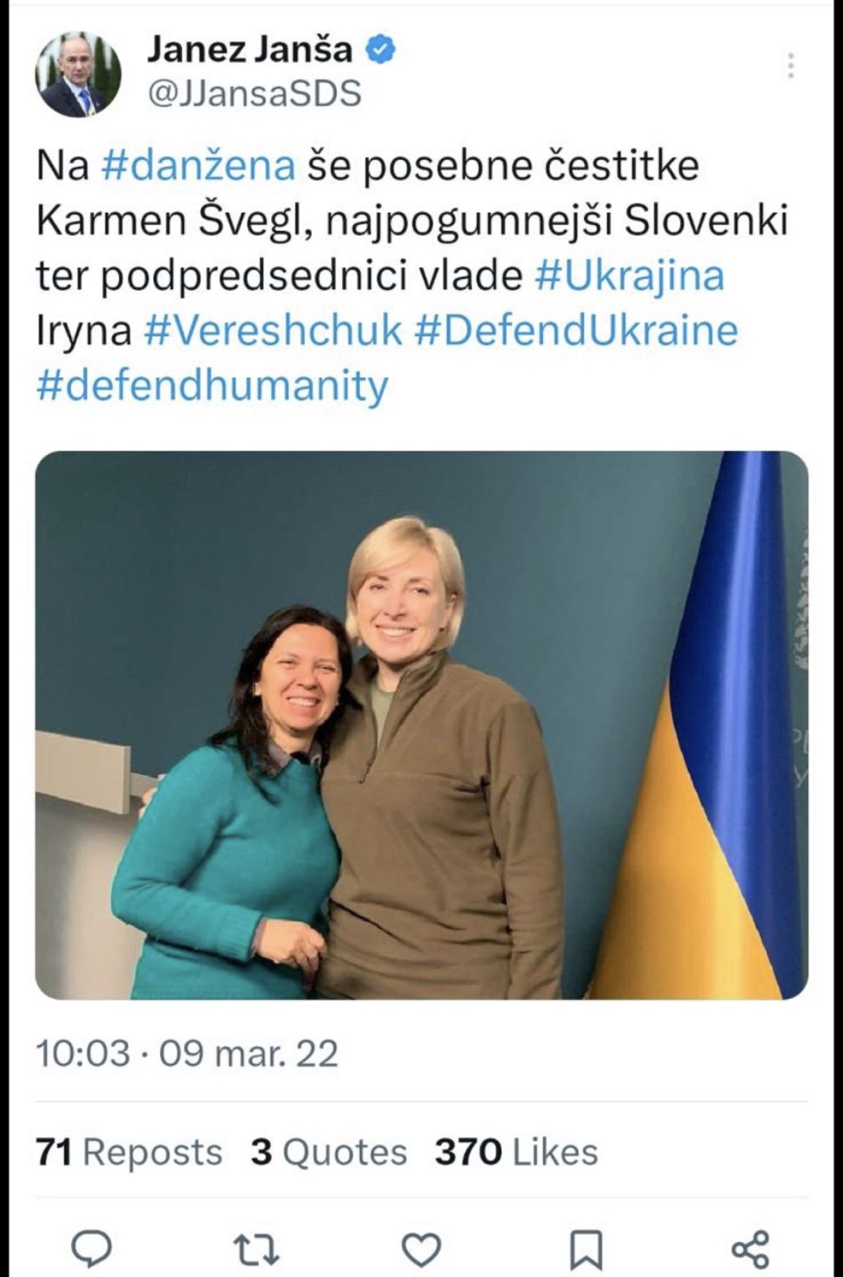 Zanimivo, da je Šveglovo leta 2022 takratni predsednik vlade Janez Janša razglasil za najpogumnejšo Slovenko in ji izrekel posebne čestitke za dan žena.