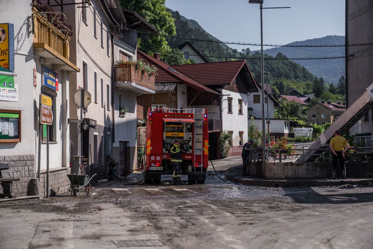Po vremensko pestrem četrtku z neurji danes nadaljujejo ocenjevanje in sanacijo škode. Tudi v Cerknem, kjer so zaradi obilnih padavin v četrtek poplavljali vodotoki, voda je drla po cestah in zalivala objekte, precej pa je poškodovana tudi Partizanska bolnica Franja. Objavljamo fotografije iz te občine, ki jo je neurje še posebej prizadelo.