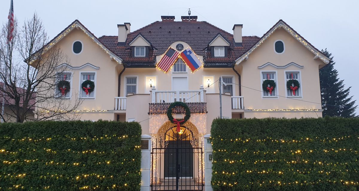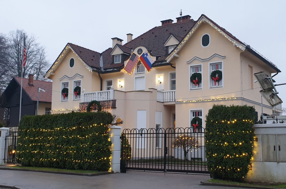 Zakaj pa ne? Fotografijo ameriške rezidence v Ljubljani bi lahko uporabili za božično-novoletno voščilnico. Rezidenca v adventnem času namreč zelo izstopa po izjemno bogati, atraktivni božični okrasitvi.