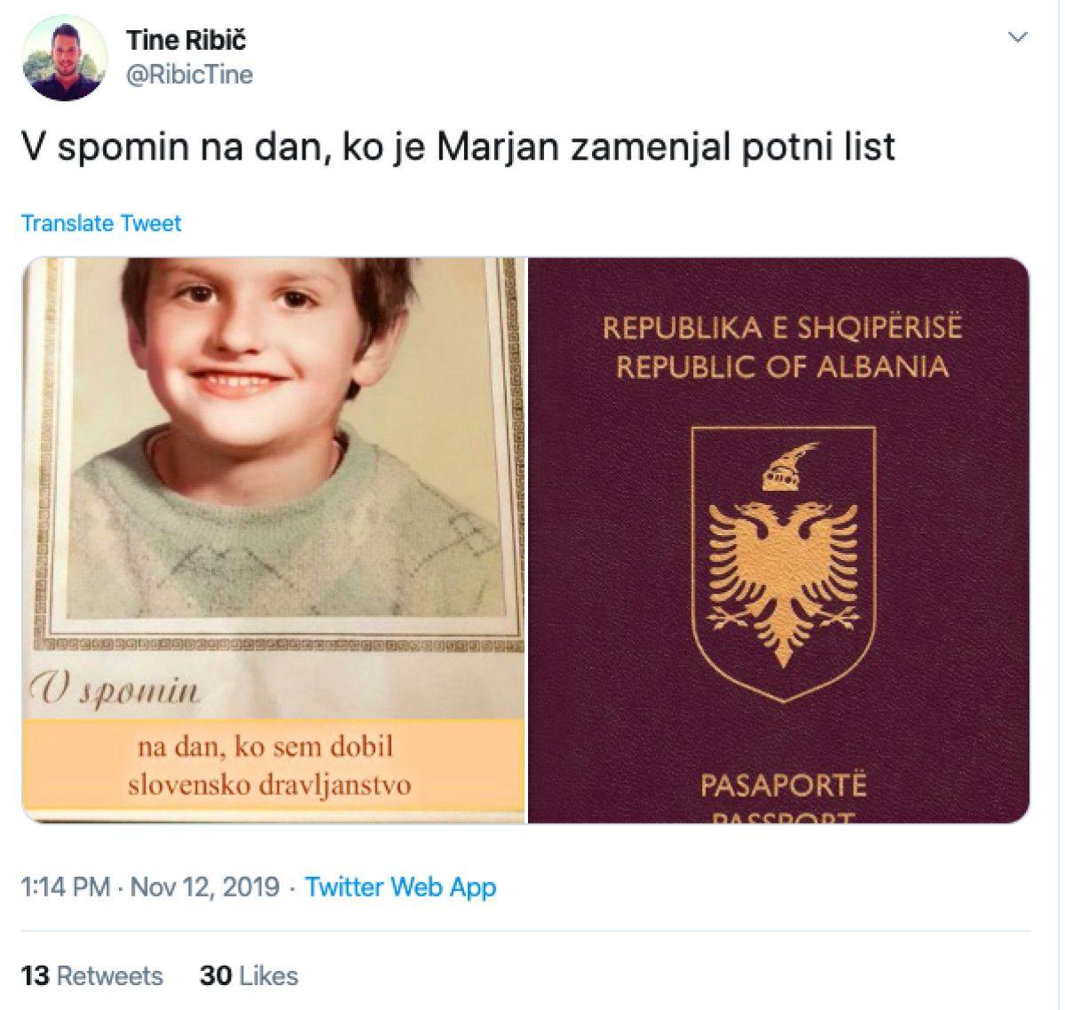 »V spomin na dan, ko je Marjan zamenjal potni list,« je na tviterju zapisal Tine Ribič in priložil fotografiji Marjana Šarca iz otroških let in potnega lista Republike Albanije.