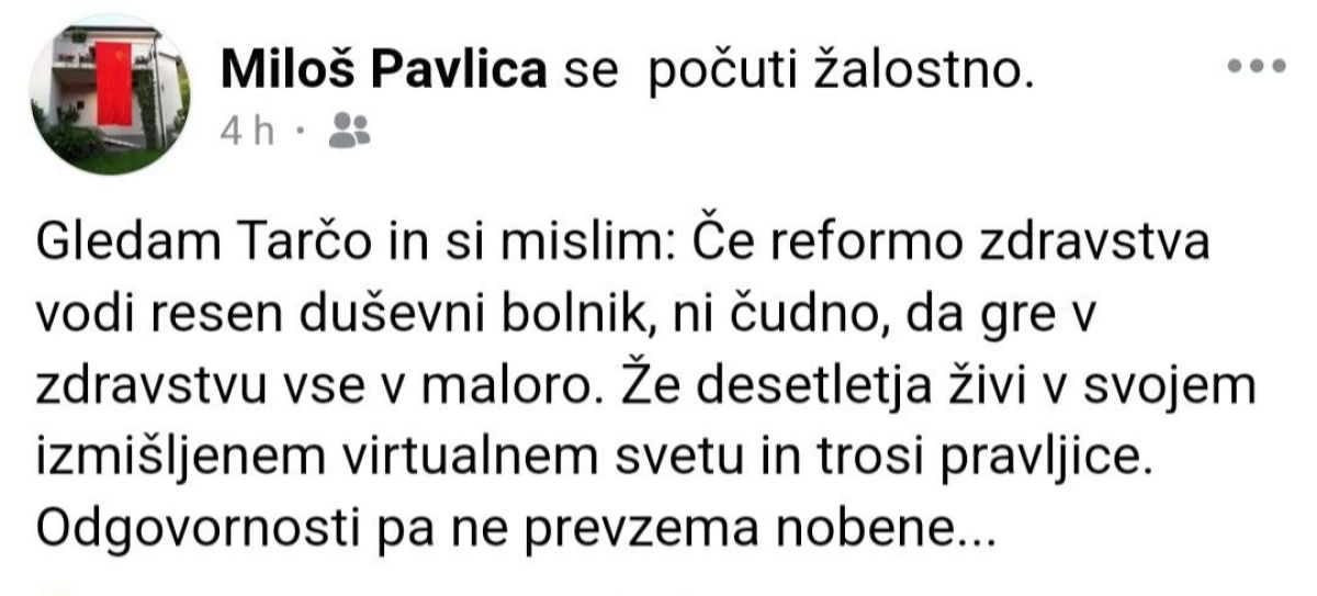 Brecljeva izjava pa je očitno razkurila Miloša Pavlico, zdaj že upokojenega dolgoletnega politika SD, ki je na facebooku zapisal: »Gledam tarčo in si mislim: če reformo zdravstva vodi resen duševni bolnik, ni čudno, da gre vse v maloro. Že desetletja živi v svojem izmišljenem virtualnem svetu in trosi pravljice. Odgovornosti pa ne prevzema nobene.«